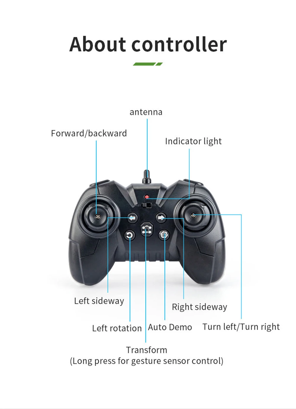 Пульт дистанционного управления часов: вперед, назад, влево, вправо, влево, траверс, правый траверс, на месте левое вращение, на месте правое вращение, вверх и вниз поворот, демонстрация одного ключа танца