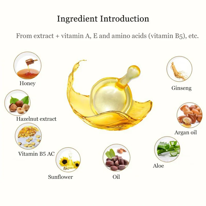 Описание:-уход за шампунем после мытья шампуня, сушить голову до тех пор, пока она не будет капать. Возьмите капсулу и нанесите соответствующее количество на волосы, которые нуждаются в уходе. Затем высушите или дайте волосам высохнуть естественным образом, оставив волосы мягкими и блестящими. -Ежедневный уход, когда волосы сухие и грубые, нанесите эфирное масло на ладонь и равномерно на середину и концы волос.