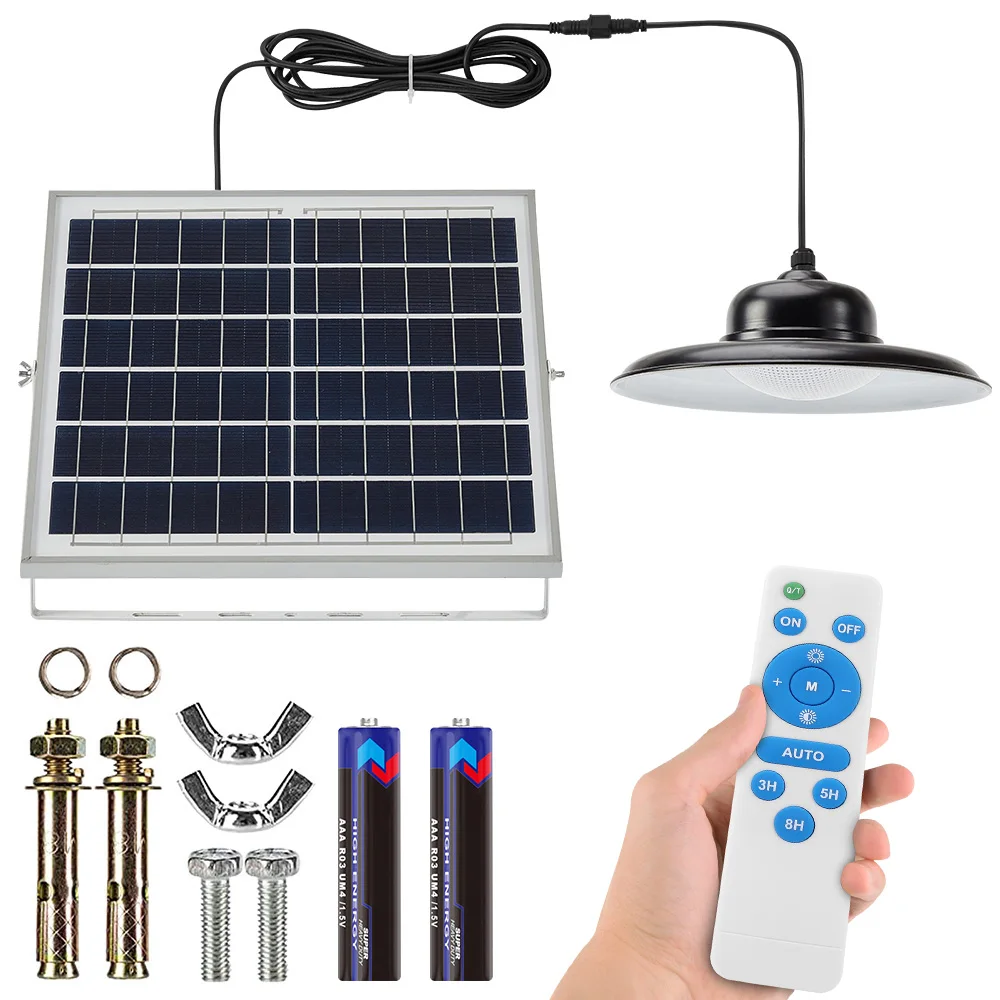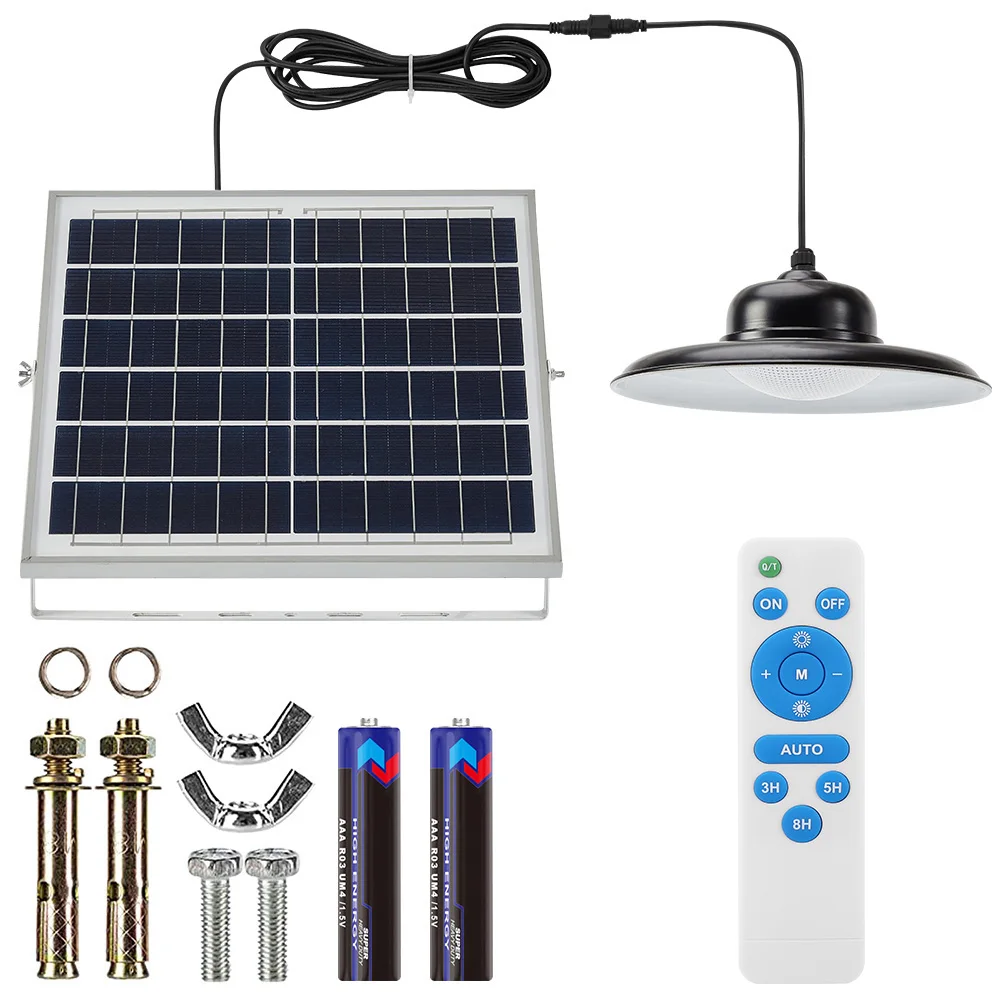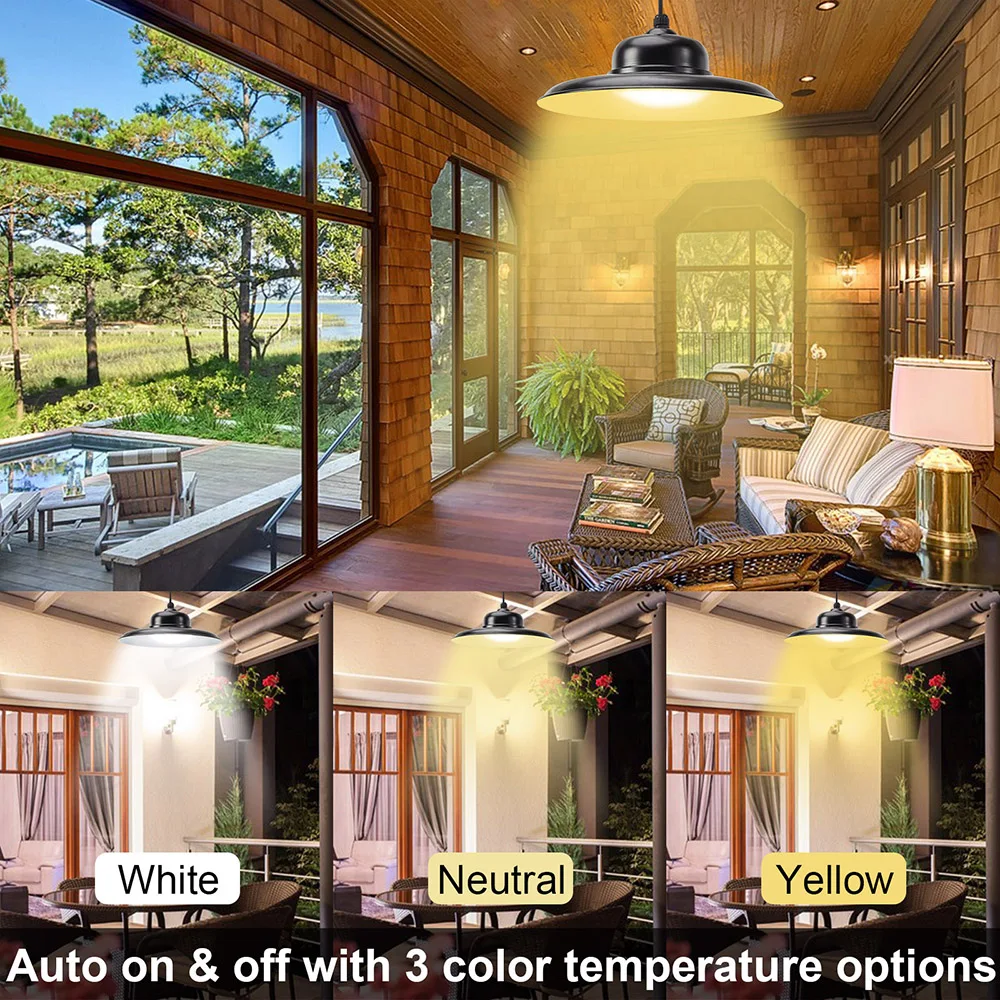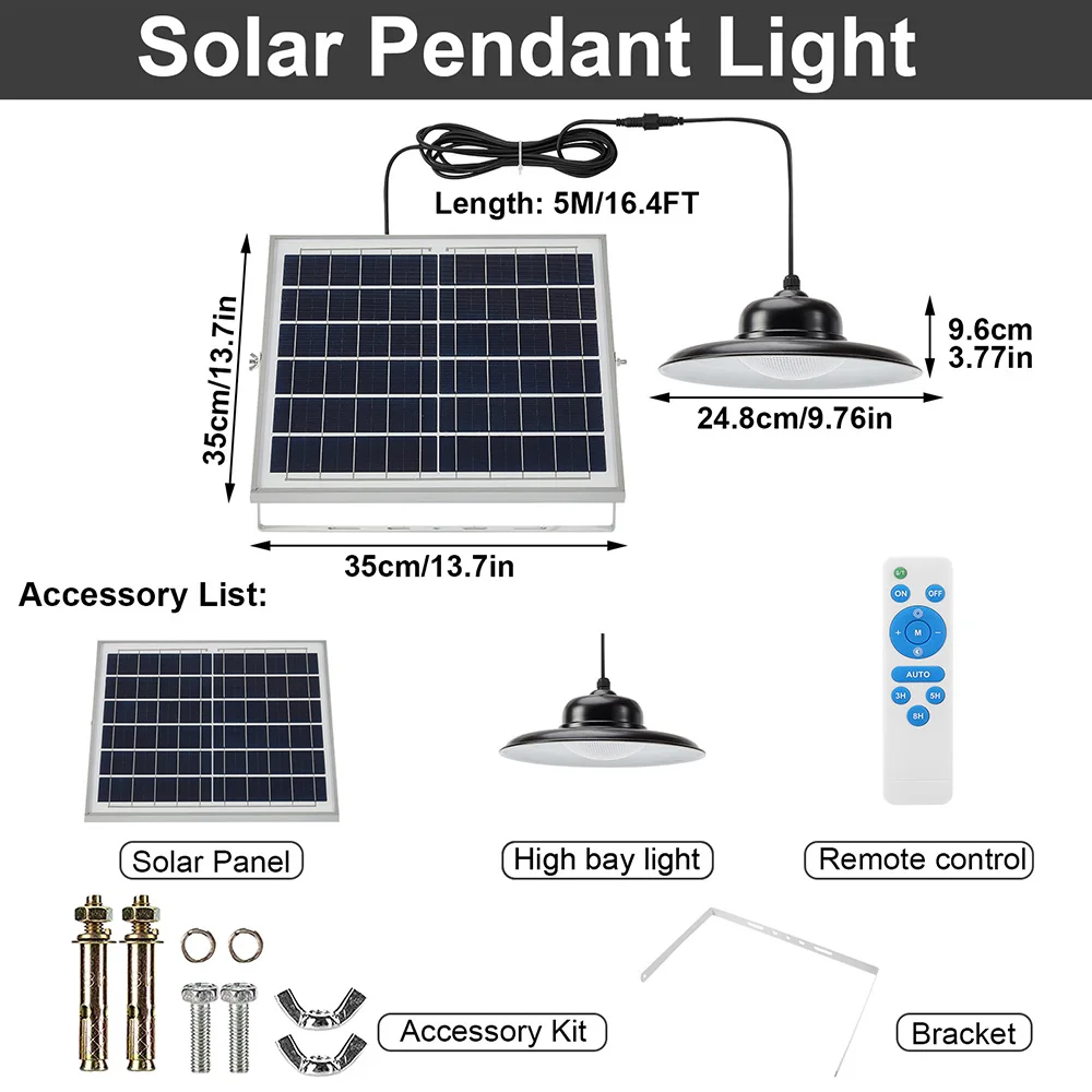 Подвесной светильник на солнечной батарее с дистанционным управлением, 3000K/4500K/5000K, 3 цвета, с регулируемой температурой, таймер для наружного использования в помещении, IP65, водонепроницаемый настенный светильник для безопасности, для помещений, магазинов, двора, гаража, крыльца, передней двери Описание: Особенности: * Супер большой размер и 3 Цветовая температура: супер большая солнечная панель (35x3 5 см/13,7x13,7 дюйма) и абажур (dia. 24,8 см/9,76 дюйма), каждый абажур с 82 шт. супер высокой яркостью SMD2835 светодиодный, 3000K/4500K/5000K цветовой температуры, которые могут быть изменены с помощью пульта дистанционного управления. * Двухцелевой светильник ing версия: наш солнечный светильник High Bay может работать с пультом дистанционного управления или без него, каждый абажур с дистанционным приемником сигнала, если вы хотите использовать пульт дистанционного управления лампой, используйте пульт дистанционного управления для включения-выключения светильник; Если хотите, чтобы лампа автоматически включала светильник ночью, Просто выберите автоматический режим с пульта дистанционного управления, сделайте лампу автоматической зарядкой в дневное время и светильник ночью. Дайте вам больше выбора и очень прост в использовании. * Солнечная энергия и долгое время работы: этот подвесной светильник на солнечной батарее оснащен модернизированной солнечной панелью (6 в/25 Вт), которая имеет более высокую скорость преобразования и более быструю зарядку. Встроенный литий-ионный аккумулятор емкостью 10000 мАч, солнечный подвесной светильник может светильник до 16-32 часов при полной зарядке. С датчиком на светильник, наружный солнечный светильник заряжается в течение дня и использует пульт дистанционного управления или автоматически включается ночью. (Примечание: Перед установкой или зарядкой Включите переключатель на задней панели солнечной батареи.) * Наружное и внутреннее использование: каждый светильник для сарая поставляется с 1 шт. 5 м/16,4 фута удлинительных шнуров, в которых солнечная панель находится на открытом воздухе, И солнечный светильник можно разместить в помещении или в любом месте, где вы хотите светильник. Идеальное освещение для комнаты, балкона, двора, веранды, патио, ландшафта, передней двери, прихожей, мастерской, теплицы, гаража, сарая, сарая для хранения, курятника, стабильной, парковки, И т. д. * Прочный и водонепроницаемый IP65: светодиодный подвесной светильник на солнечной батарее изготовлен из высококачественного АБС-пластика и поликарбоната, кронштейна из алюминиевого сплава, термостойкости, не легко стареть. С IP65 водонепроницаемостью, любой погодой, подходит для использования на открытом воздухе. * Хорошее соотношение цены и качества: высокая оплата электроэнергии? Нет! Экономьте сотни долларов, если вы используете наши солнечные подвесные светильники, не только для защиты окружающей среды, но и для экономии денег, непрерывная Солнечная энергия делает это для вас. Характеристики: Солнечная панель: 6 В/25 Вт поликремний Аккумулятор: 1X 10000 мАч Материал: Allory + ABS + PC пластик Люмен: 400 лм Количество СВЕТОДИОДНЫЙ: 82 шт. SMD2835 светодиодный бисер Светильник Цвет: теплый белый, нейтральный белый, белый Цветовая температура:3000K, 4500K, 5000K Размер панели солнечных батарей: 35x3 5 см/13.7x13.7in Размер абажура: Dia. 24,8 см/9,76 дюйма Длина кабеля: 5 м/16,4 фута Пульт дистан