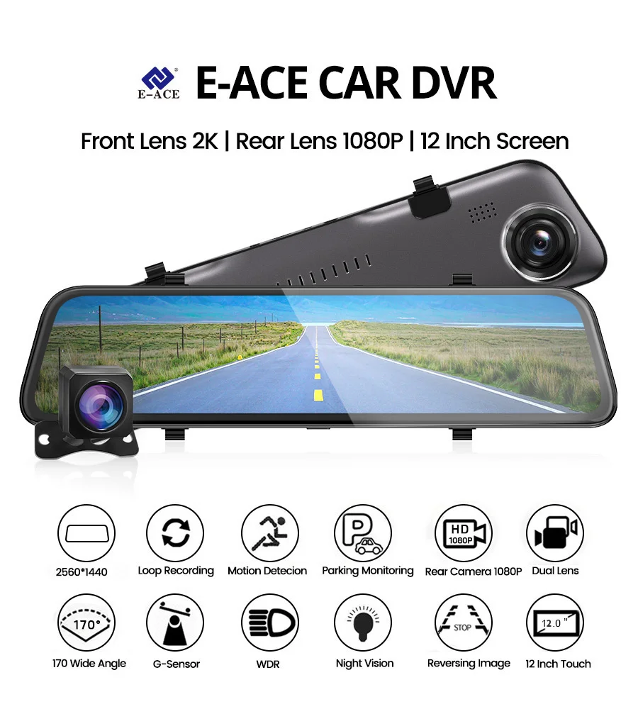 E-ACE 2K СТРИМ медиа тире камера зеркало 12 ''сенсорный автомобильный видеорегистратор 1440P видео регистратор поддержка GPS 1080P камера заднего вида ночное видение