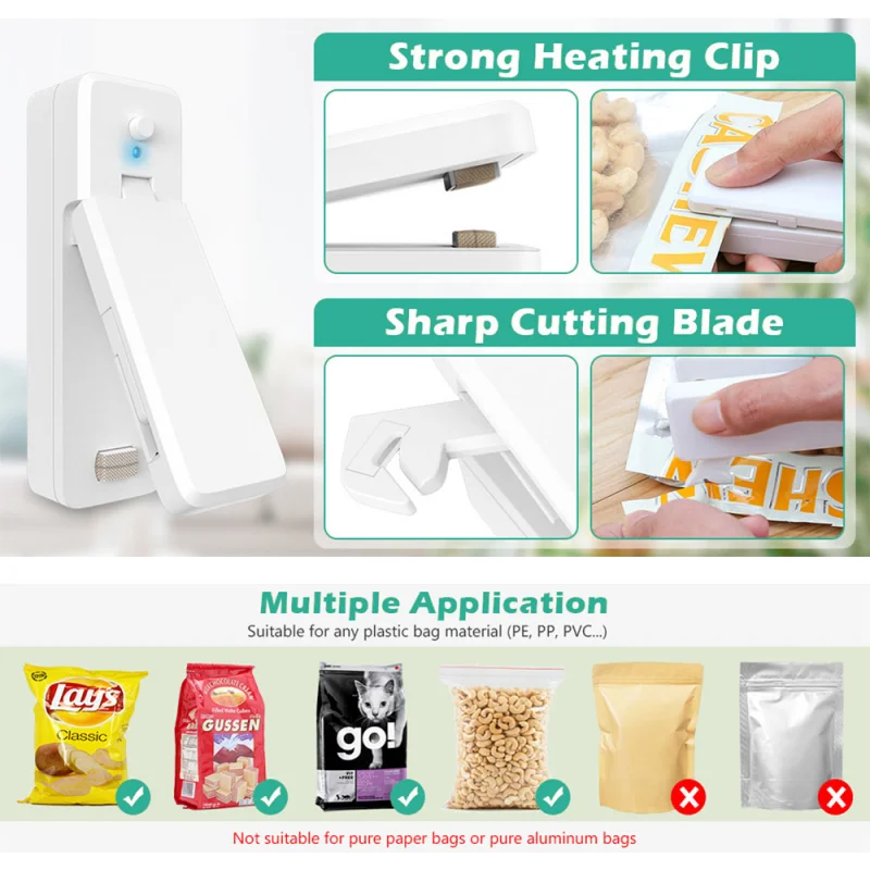 1. Два в одном Термоупаковщик: Этот мини-пакет упаковщик очень подходит для упаковки и предотвращения того, чтобы еда и закуски становились влажными.
