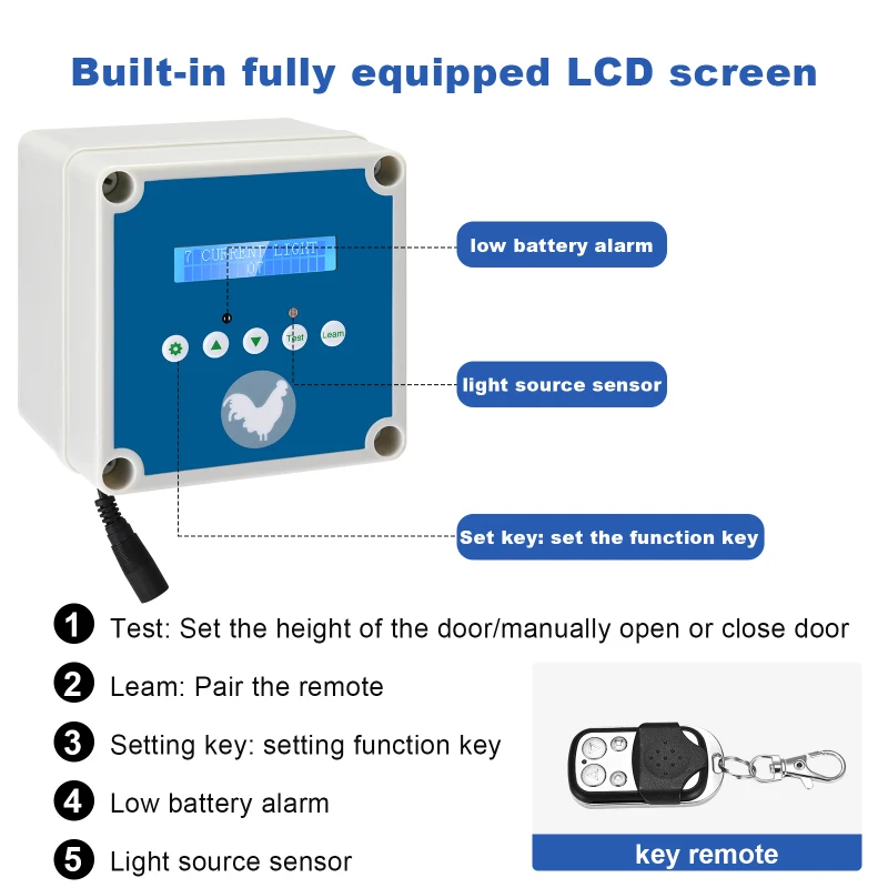 Автоматическая дверь курятника с датчиком таймера и светильник, с ЖК-экраном, функция будильника с низкой батареей, четыре режима настройки, два пульта дистанционного управления
