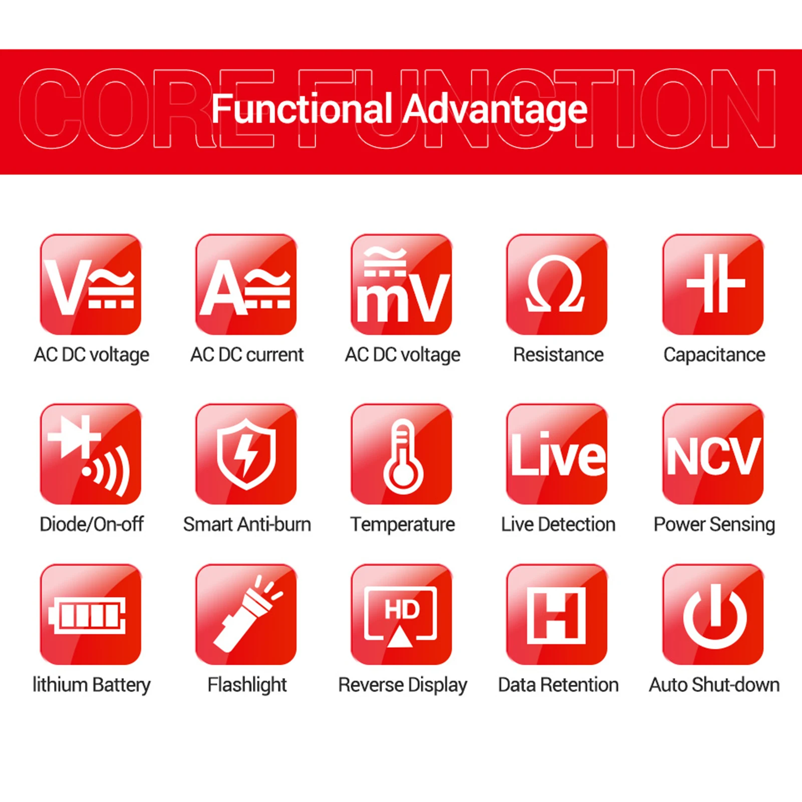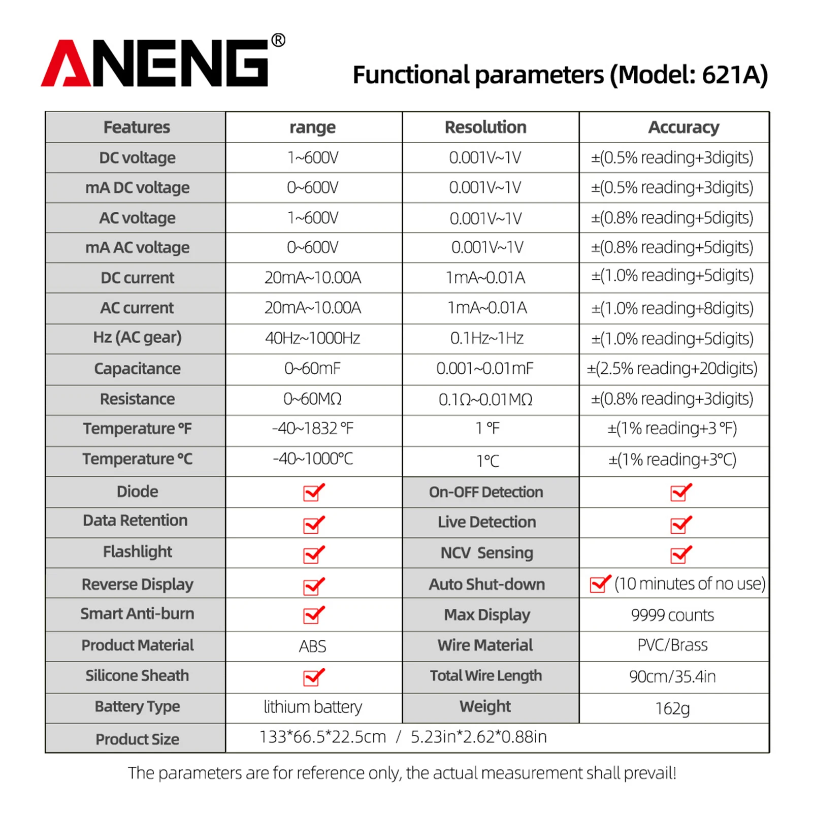 Интеллектуальный мультиметр с несколькими функциями: он может измерять ток переменного/постоянного тока, напряжение переменного/постоянного тока, сопротивление, емкость, температуру, частоту, непрерывность и диодный тест, обнаружение провода огня.