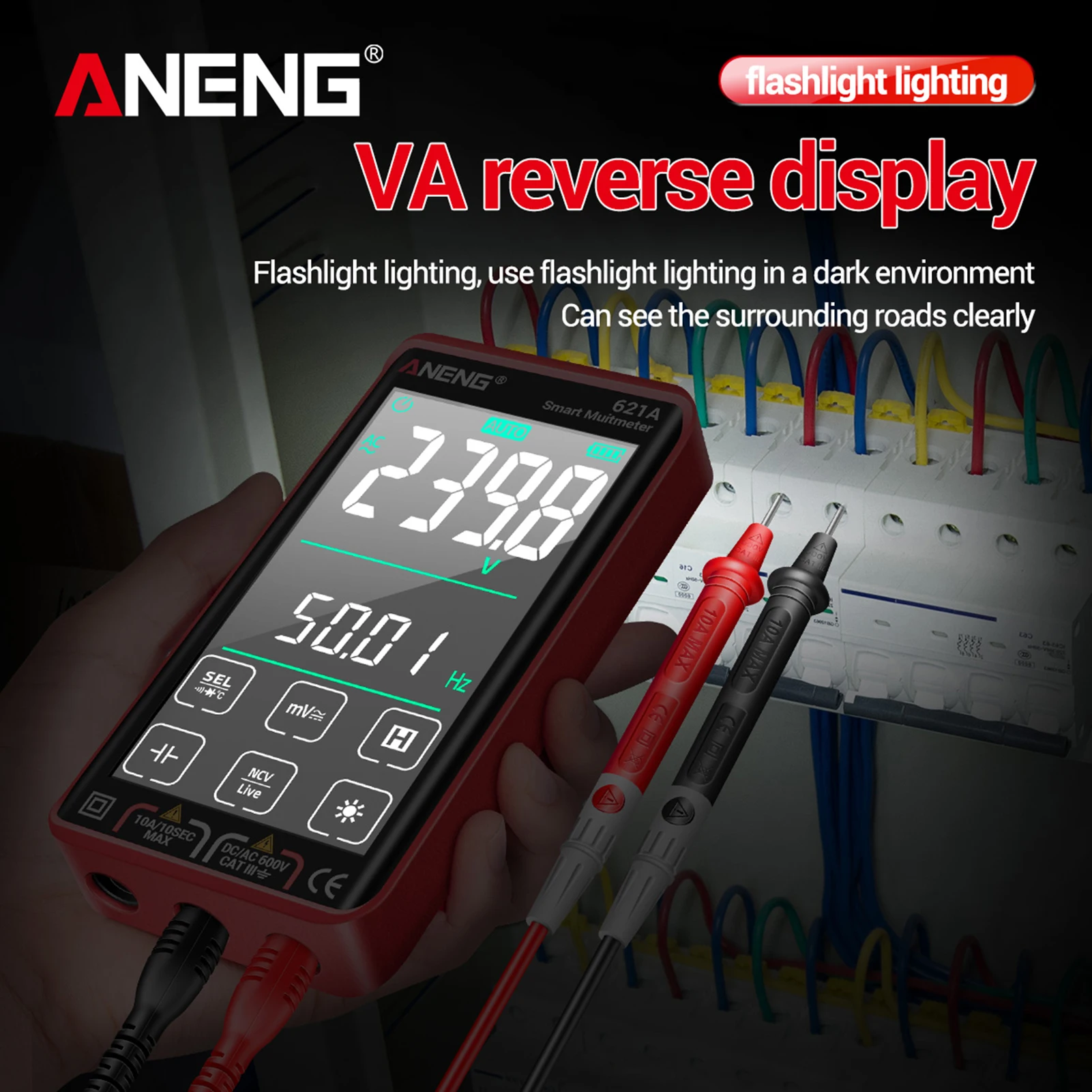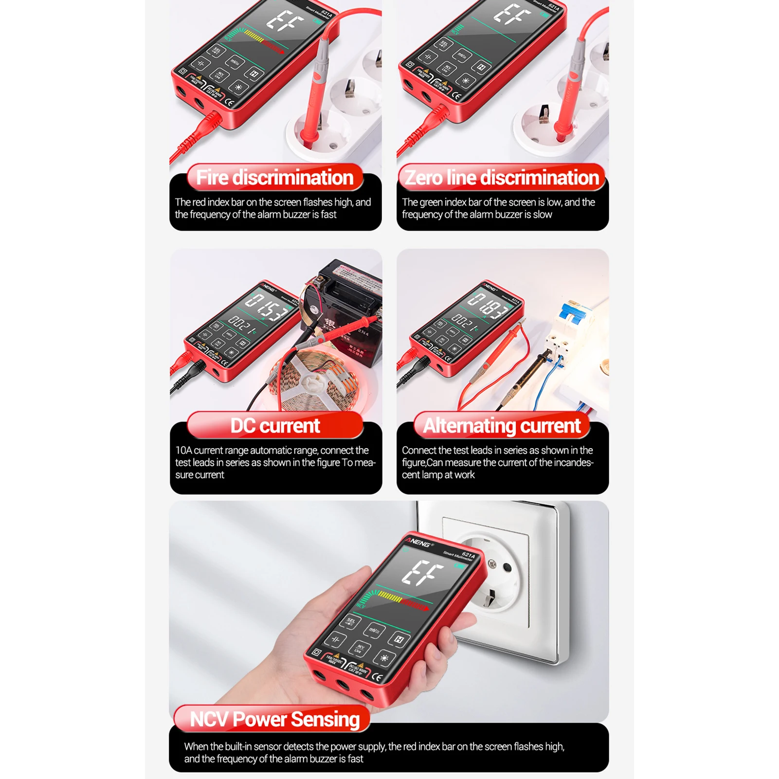 Бесконтактное Обнаружение напряжения NCV: Поместите датчик NCV ближе к измеренному кабелю, и мультиметр может определить, превышает ли напряжение 90ACV. При обнаружении напряжения переменного тока звуковой сигнал измерителя и аналоговый ЖК-дисплей отображают интенсивность индукции.