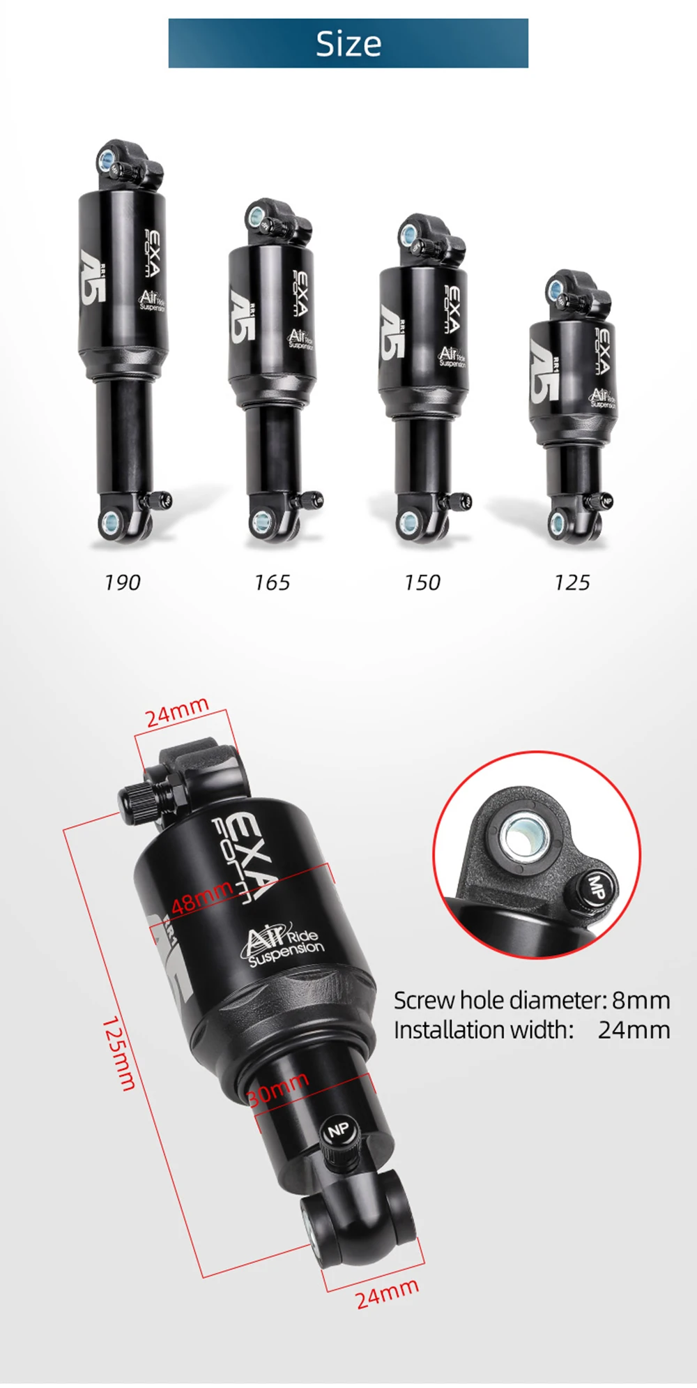 - Eye to eye: 125/150/165/190mm