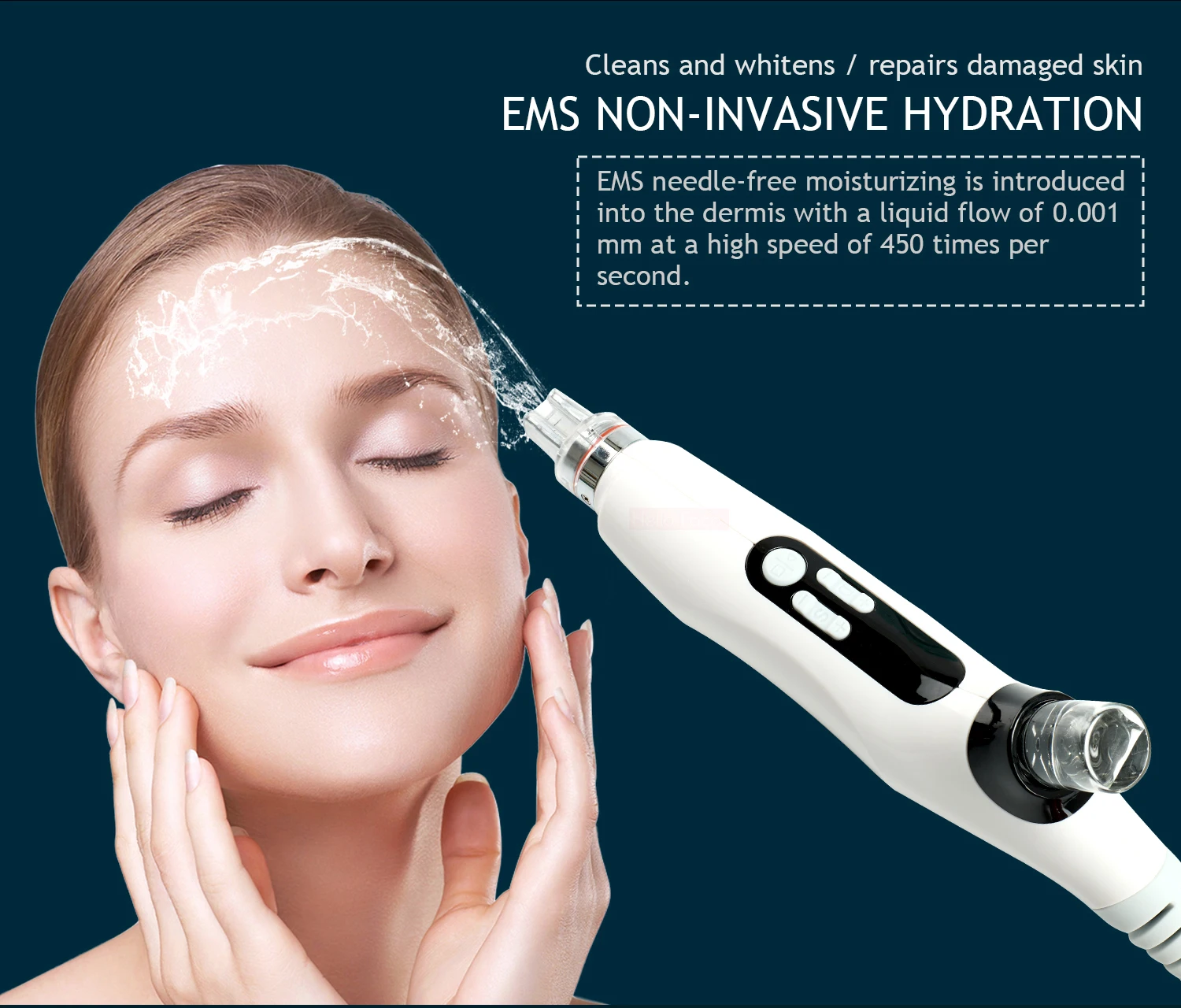 EMS светильник для воды без иглы протекает в жидком состоянии 0,001 мм. При высокой скорости 450/сек канал кожи через вакуумные микрокристаллы вводится в дерму для достижения прочного увлажнения, что решает проблему поглощения и делает ее Безболезненной и неинвазивной