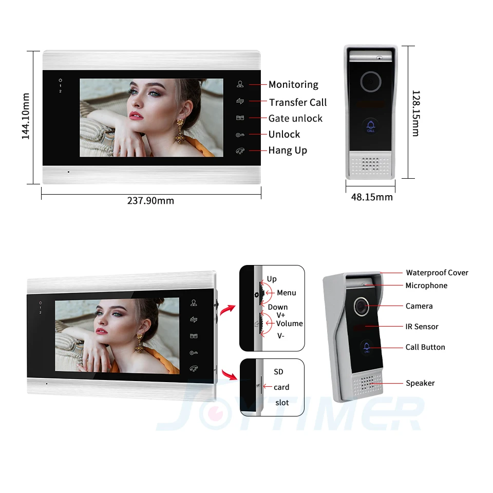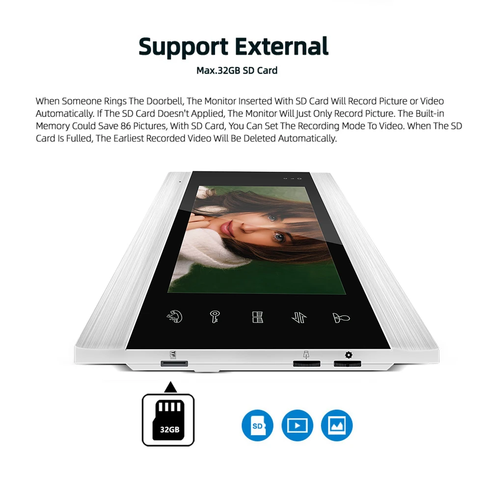Когда кто-то звонит в дверной звонок, монитор, вставленный с sd-картой, будет записывать изображение или видео автоматически. Если sd-карта не применяется, монитор будет только записывать изображение. Встроенная память может сохранять 86 фотографий, с sd-картой, вы можете настроить режим записи на видео. Когда sd-карта будет заполнена, самое раннее записанное видео будет удалено автоматически.