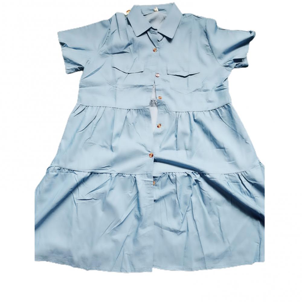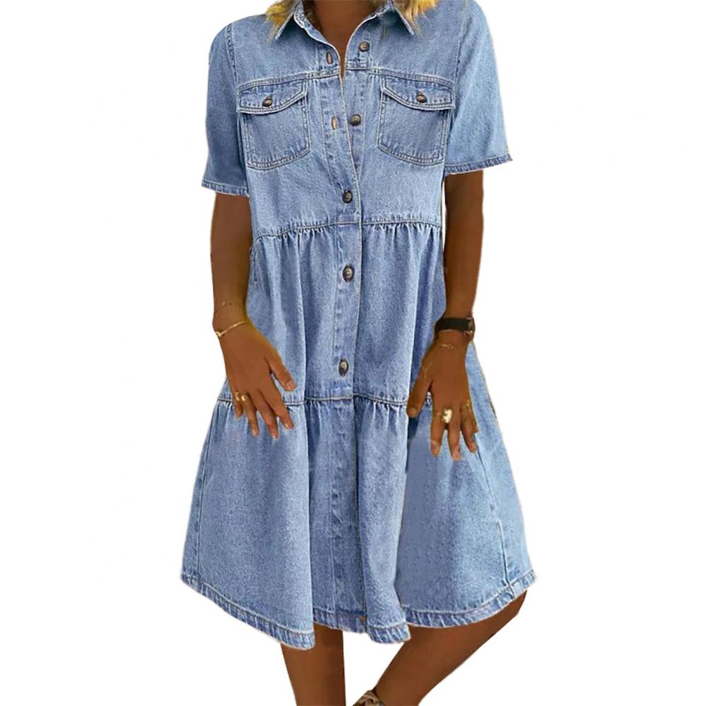 Женское однобортное джинсовое платье с коротким рукавом и отложным воротником и карманами