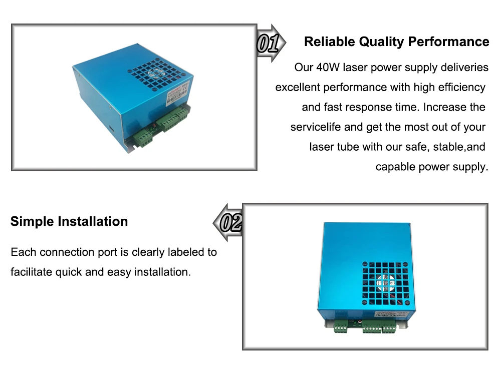 1. Надежное качество: наши лазерные источники питания мощностью 40 Вт обеспечивают превосходную производительность, высокую эффективность и быстрое время отклика. Увеличьте срок службы и получите максимум от вашей лазерной трубки с нашим безопасным, стабильным и мощным источником питания.