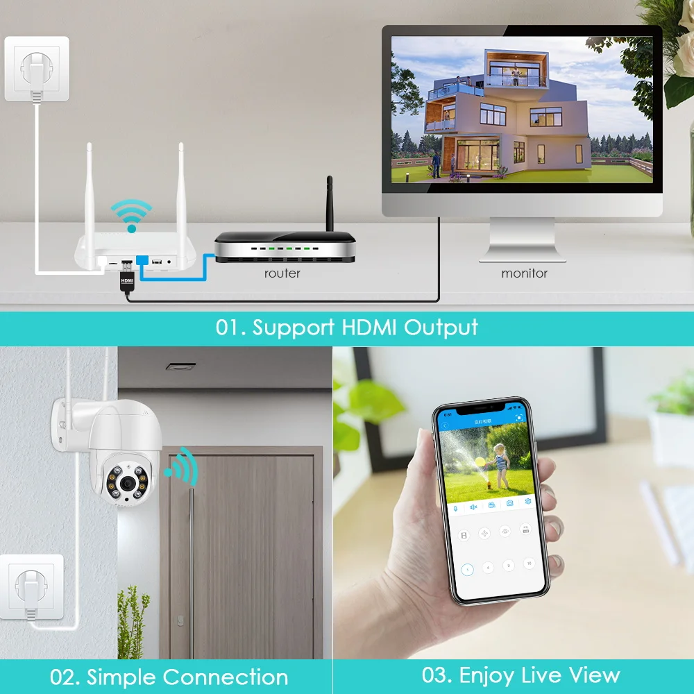 Просто Подключите камеру и NVR к источнику питания и подключите NVR к маршрутизатору для использования, что очень удобно (необходимо использовать с нашей индивидуальной камерой)