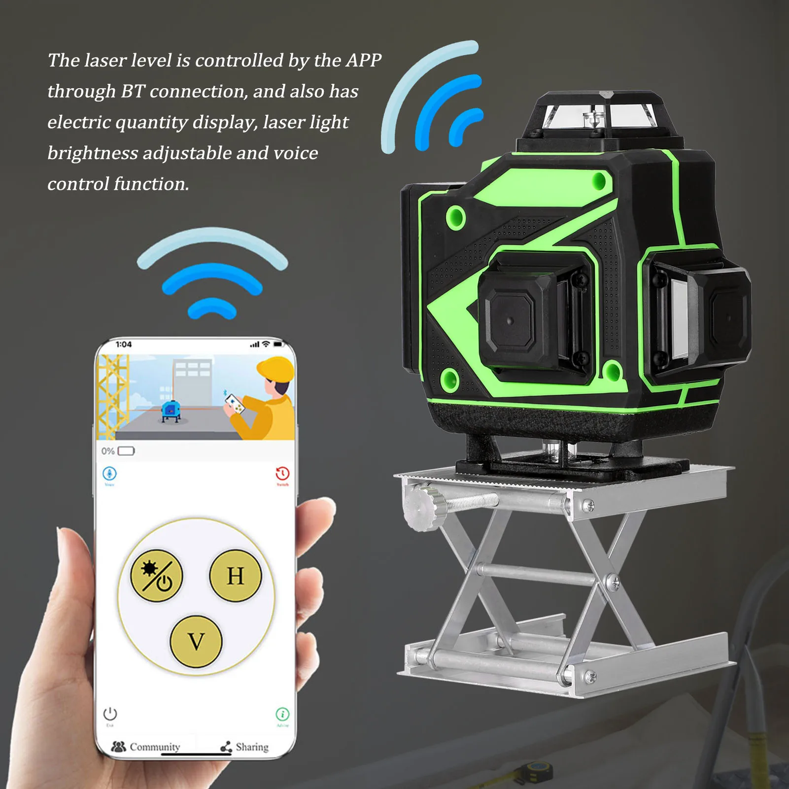 Лазерный уровень контролируется приложением через подключение BT, а также имеет Электрический дисплей количества, Регулируемый лазерный светильник и функцию голосового управления.