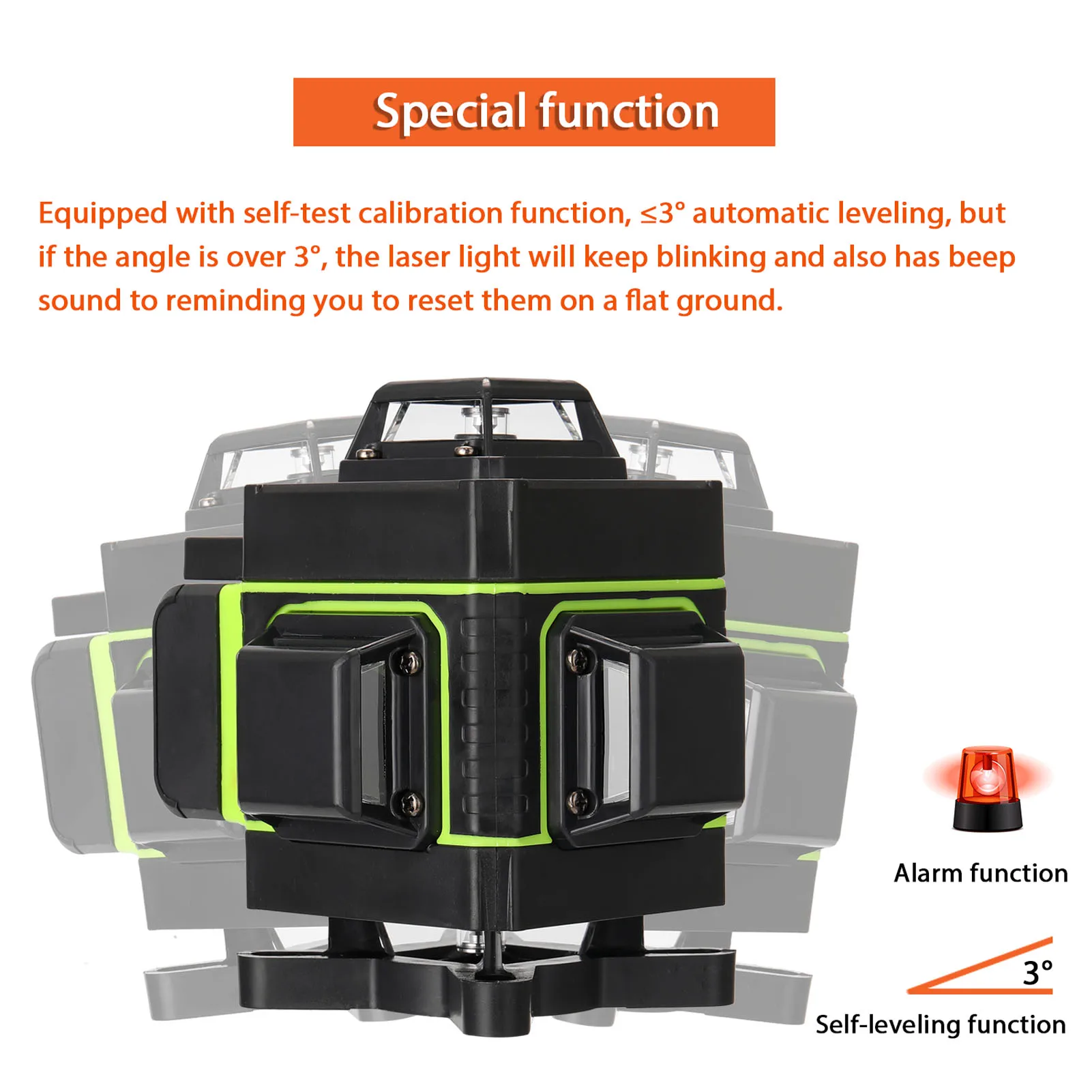 Оснащен функцией самостоятельной калибровки, ≤ 3 ° автоматическое выравнивание, но если угол превышает 3 °, лазерный светильник будет продолжать мигать, а также имеет звуковой сигнал, чтобы напомнить вам, чтобы сбросить их на ровную поверхность.