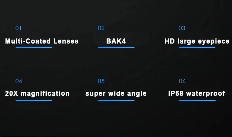 1. Большое увеличение: великолепие в 20 раз, оно может обеспечить более широкий и ультра дальний опыт наблюдения.