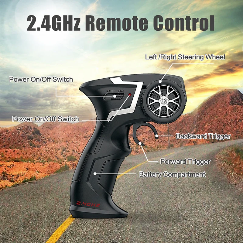 1. Пульт дистанционного управления 2,4G, несколько человек могут работать в то же время, не мешая друг другу, и могут реализовать те же полевые гонки;