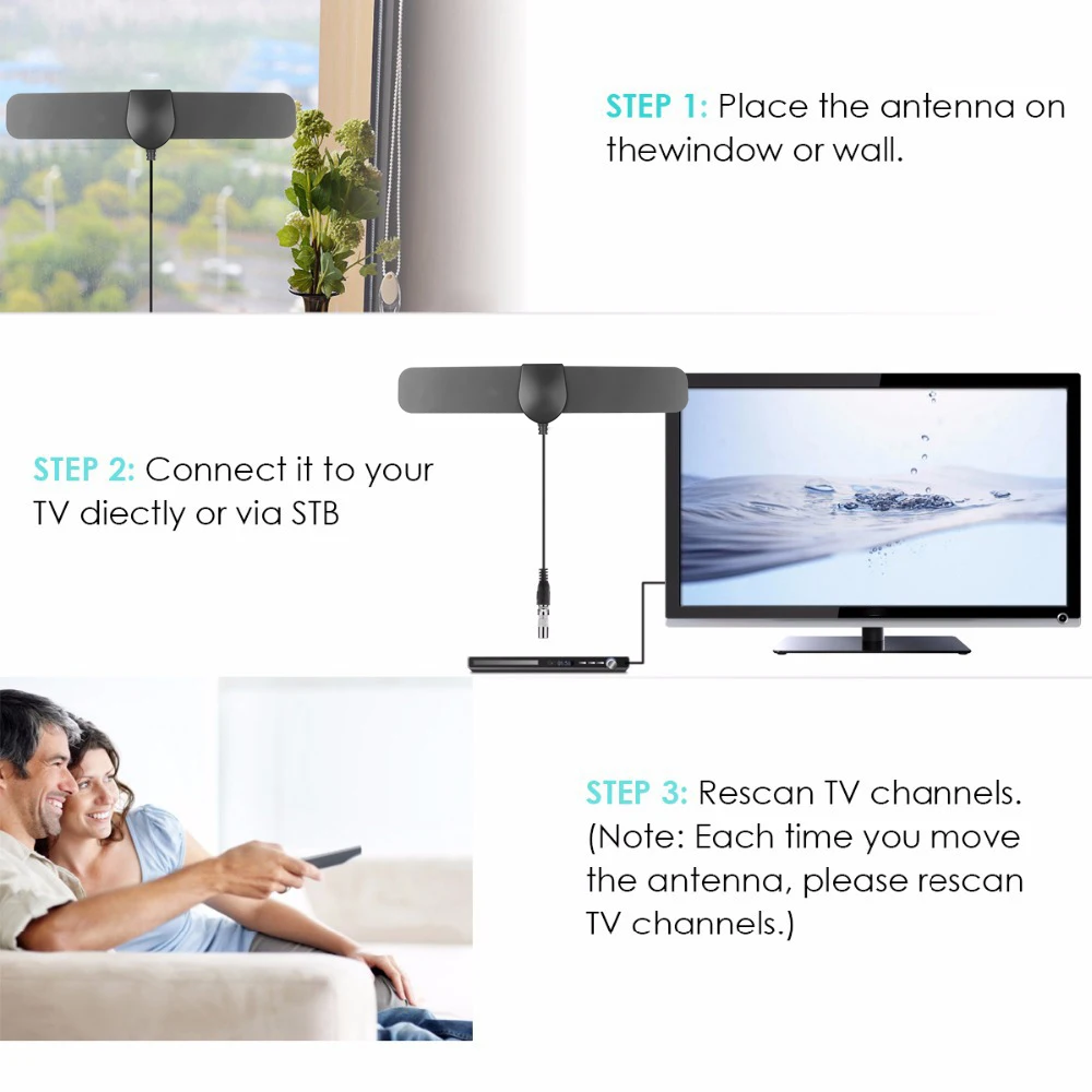 3. Сила сигнала антенны может варьироваться в зависимости от расстояния от башни, местности и погоды. При необходимости Установите антенну в другом месте. Лучше всего, чтобы антенна была в прямой видимости с ТВ-башней и избегайте препятствий. Всегда повторно Сканируйте каналы после перемещения антенны.