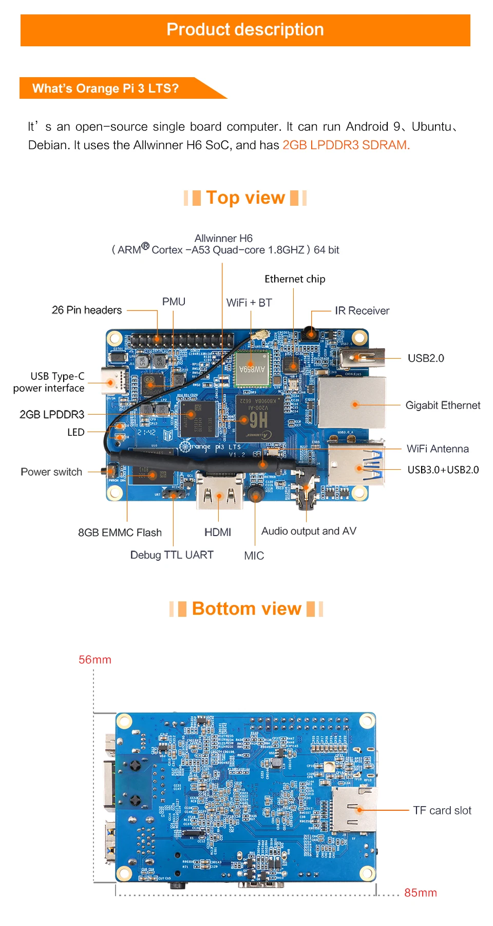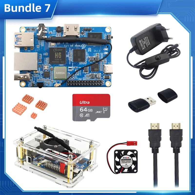 Оригинальный Orange Pi 3 LTS 2G RAM 8G EMMC WIFI BT5.0 Gigabit 1,8 Ghz AllWinner H6 SoC Мини компьютер Android 9,0 Ubuntu Debian OS