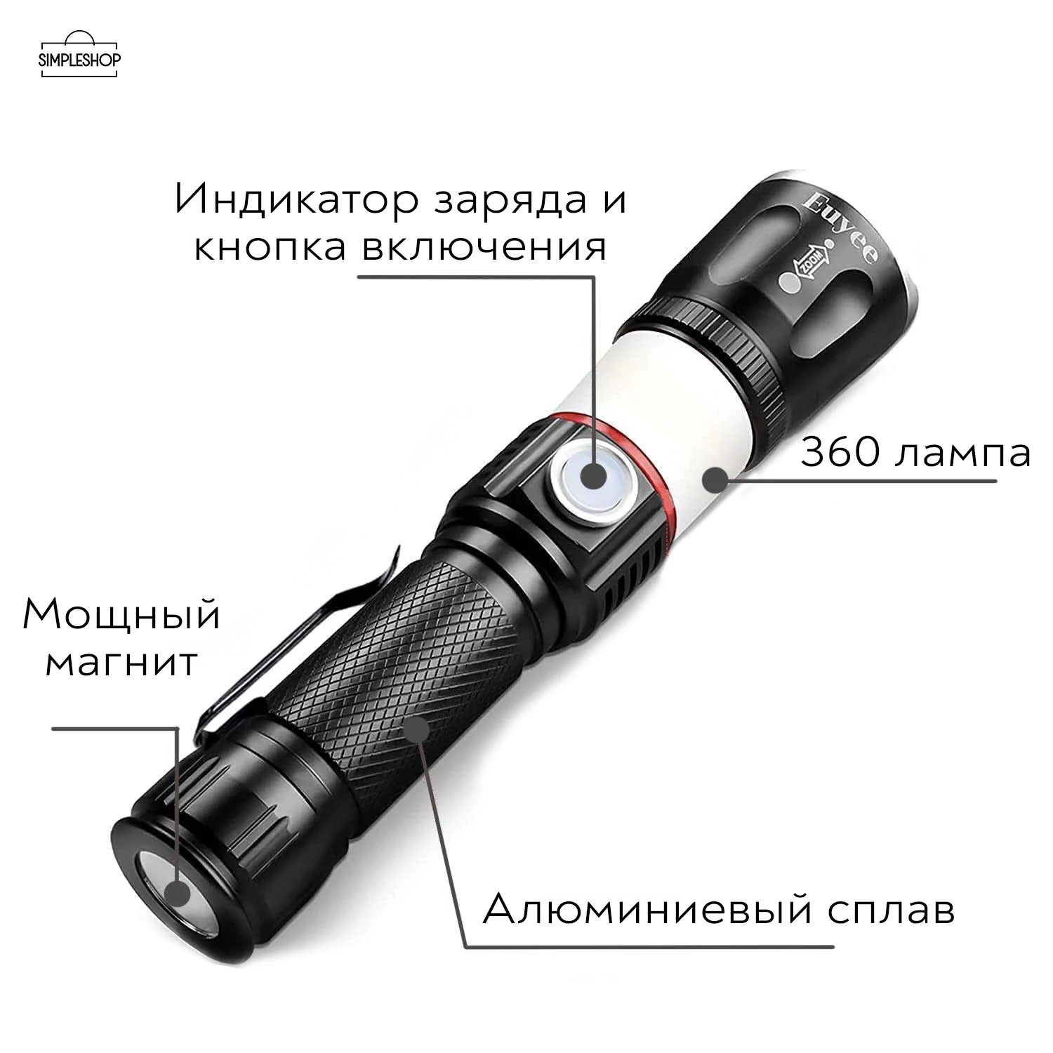 Ручной светодиодный фонарь от SimpleShop с LED светодиодом отлично подходит всем тем, кому приходится что-то разглядеть в абсолютной темноте. Это любители ночной рыбалки, охотники, туристы, водопроводчики, электрики и даже спасатели. Надёжное изделие позволяет решить сложные проблемы, связанные с отсутствием света. Фонарик можно использовать как в обычных условиях, так и при отсутствии сетевого электричества. Фонарь может работать от автомобиля, ноутбука, пауэр-банка, электрической сети. У фонаря есть три режима освещения, функция светильника. на тыльной стороне ручки фонаря имеется сильный магнит.Благодаря качеству материалов обеспечивается длительный срок службы. Даже в экстремальных условиях фонарь продолжает работать. Его можно использовать под дождём, случайно уронить в воду, включать при морозе и сильной жаре. Будучи перезаряжаемым, он непрерывно обеспечивает яркий свет в течение 7 часов и более. Инструкция к использованию: