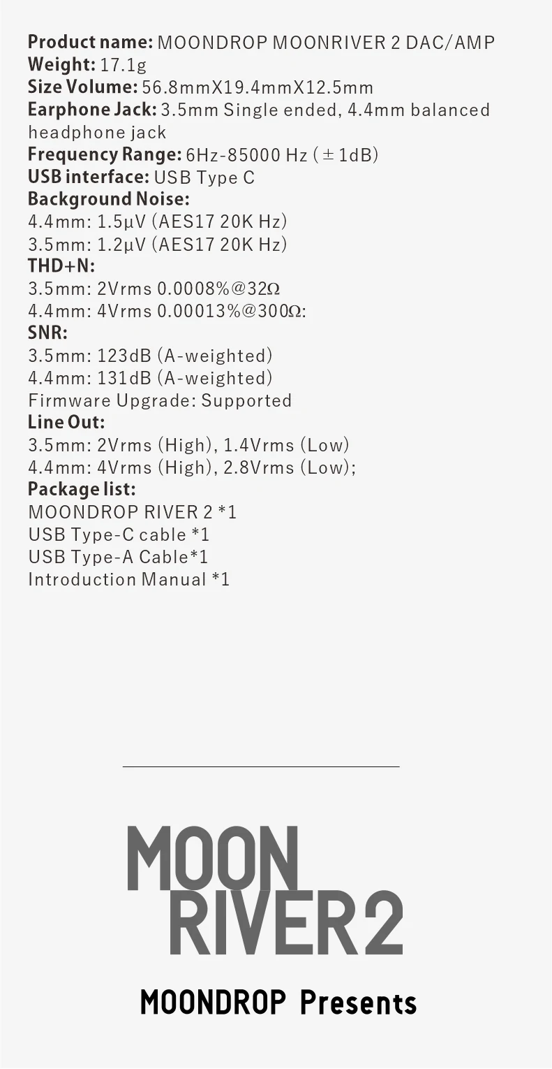 Посылка: MOONDROP RIVER 2*1 USB Type-C кабель * 1 USB Type-A кабель * 1 Руководство пользователя * 1