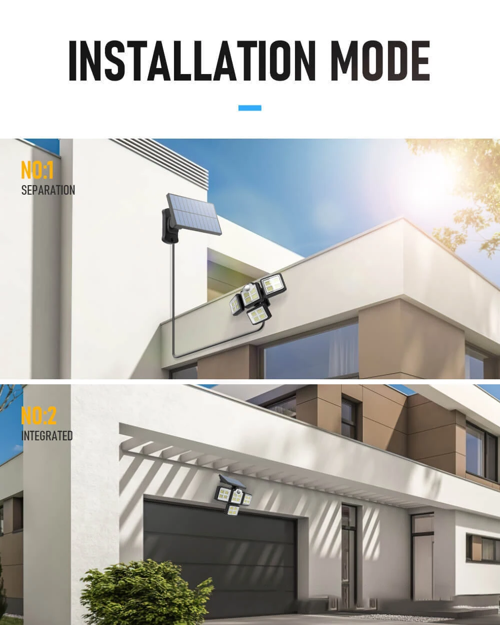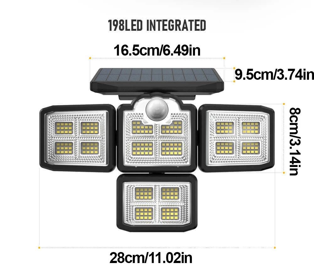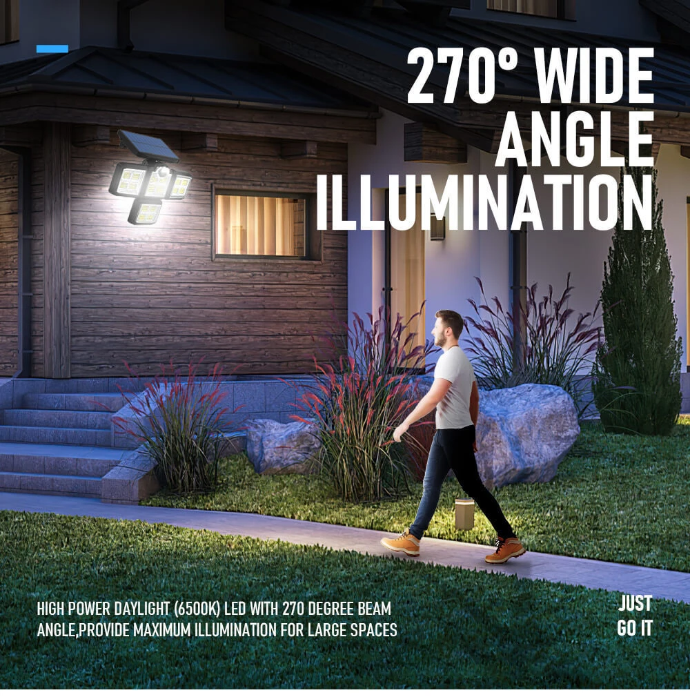 • Широкоугольное освещение на 360 °. 4 регулируемые головки обеспечивают широкоугольное освещение на 360 °. Солнечный светильник безопасности может обнаруживать движение до 3-5 метров (10-17 футов), покрывая площадь поля 120 градусов.
