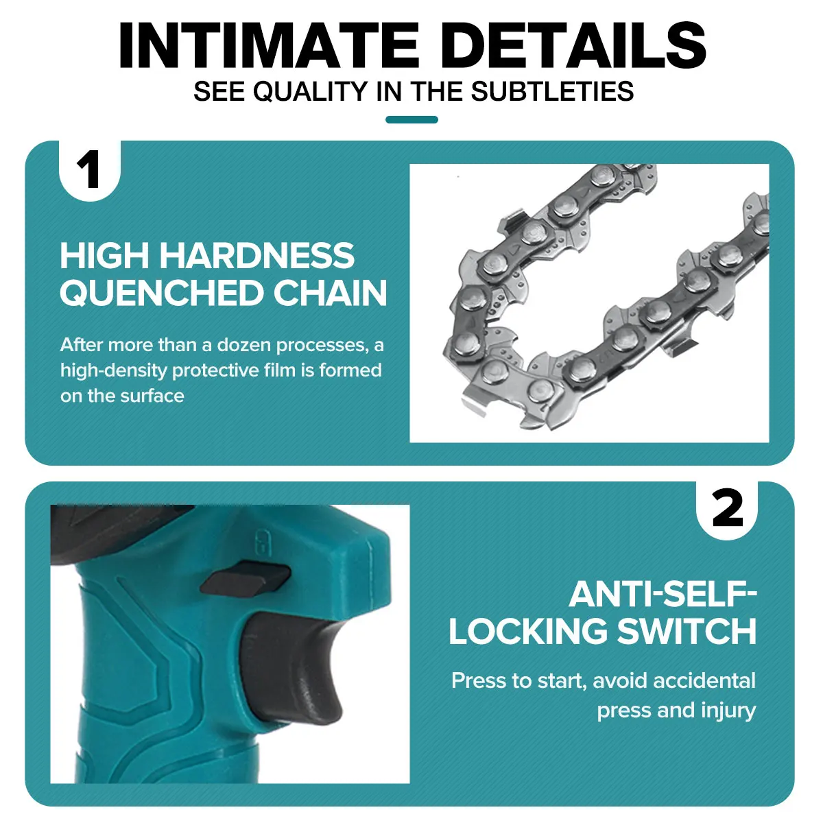 -Перезаряжаемая Электрическая цепная пила, светильник и портативный, длительный срок службы батареи и не повредит кору. -Легкий корпус, легкий и удобный, легкий дизайн, длительное время держится без усталости рук. -Двигатель из чистой меди, сильная мощность, быстрая скорость резки, повышение эффективности. -Практичное, быстрое и низкое энергопотребление. -Переключатель высокого качества, регулировка скорости, плавное изменение скорости. -Интеллектуальная плата управления цепью, защита от перегрузки, для удовлетворения ваших различных потребностей в конструкции. -Высококачественная направляющая цепь, глубокая закалка, более износостойкая, гладкая резка.