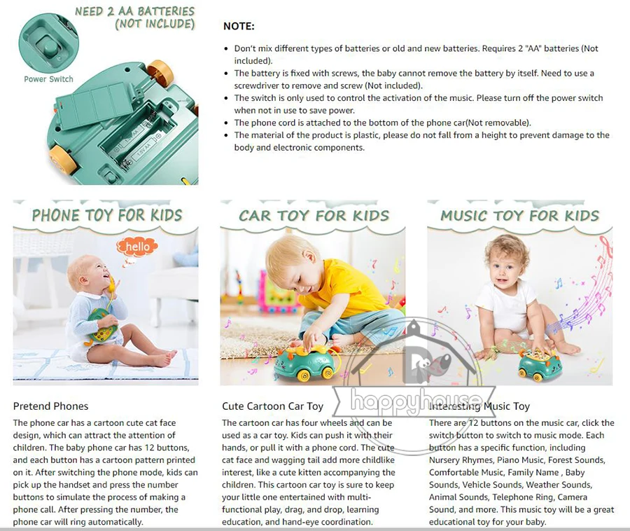 Многофункциональные телефонные музыкальные игрушки: Эти детские музыкальные игрушки имеют форму автомобиля и в общей сложности 12 кнопок, включая детские стишки, фортепианную музыку, звуки леса, удобную музыку, фамилию, Детские звуки, звук транспортного средства, звуки погоды, звуки животных, телефонное кольцо, звуковая кнопка камеры, Который может повысить интерес детей к музыке. Вы также можете нажать кнопку переключения, чтобы перейти в режим телефона.