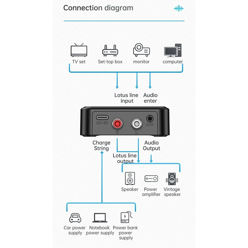 Чистый звук: A2DP поддерживает голосовые подсказки, получает высококачественный аудио звук, предлагает вам диапазон работы 30 футов с хорошей производительностью, дает вам хороший опыт во время ответа на телефон или просмотра поздних шоу. Для того, чтобы получить чистый звук, мы рекомендуем не использовать 3,5 мм Bluetooth передатчик-приемник во время зарядки.