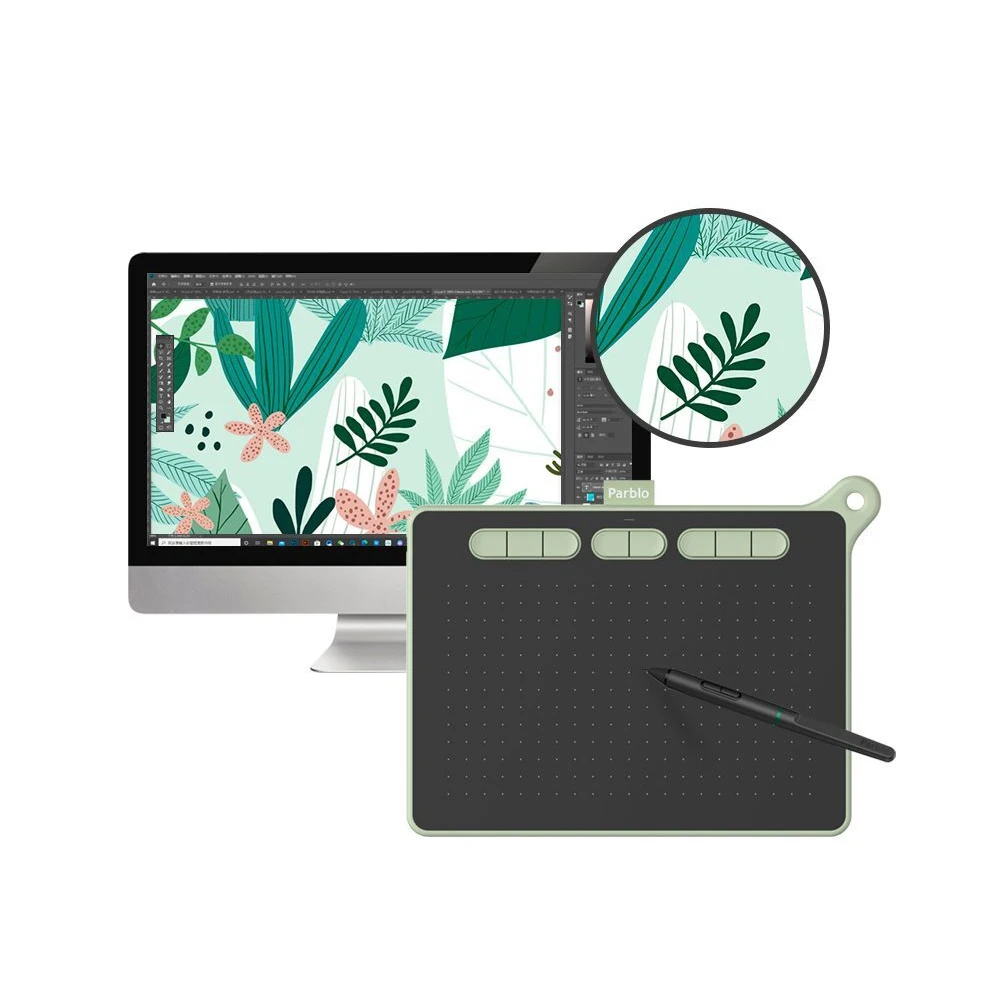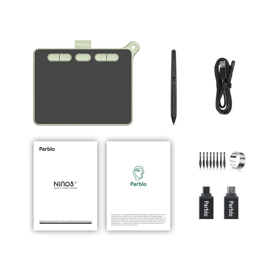 Графические планшеты Parblo серии Ninos S предназначены для начинающих и профессиональных пользователей, фотографов, увлеченных искусством и творческих людей, а также такой планшет станет прекрасным подарком для ребенка или для того, кому интересно рисование. Ninos S подойдёт для разных типов графических работ, таких как анимация, ретушь, рисование и многое другое.Продуманный дизайнБлагодаря разметке на активной области устройства начинающему пользователю будет намного проще рисовать линии или геометрические фигуры. Внешний вид планшета имеет минималистичный и в то же время эргономичный дизайн. Такой планшет легкий и его всегда можно взять с собой в любое место, чтобы не упустить момент вдохновения.5 настраиваемых клавишНа планшете в верхней части корпуса расположено 5 программируемых клавиш. Эти клавиши можно запрограммировать в драйвере (бесплатной программе, которая доступна для скачивания с официального сайта) под любые комбинации, с которыми вам будет удобно работать. Пассивное пероParblo Ninos S использует беспроводную пассивную технологию электромагнитного резонанса в стилусе, то есть перо P07 не нуждается в замене батареек или подзарядке, всегда, когда планшет подключен через кабель к ноутбуку перо будет реагировать на планшет.Отличные характеристикиРабочая область для Ninos S составляет 6 x 4 дюймов, то есть 152 x 95 мм, а его размеры составляют 197,5 х 156,5 х 8,7 мм. Parblo Ninos S имеет отличные технические показатели — скорость отклика составляет 266 PPS, что обеспечивает мгновенную реакцию без задержек, перо имеет 8192 уровня чувствительности к нажатию, высота чтения пера 10 мм и разрешение планшета 5080 LPI.СовместимостьParblo Ninos S имеет удобный интерфейс подключения Type-C.