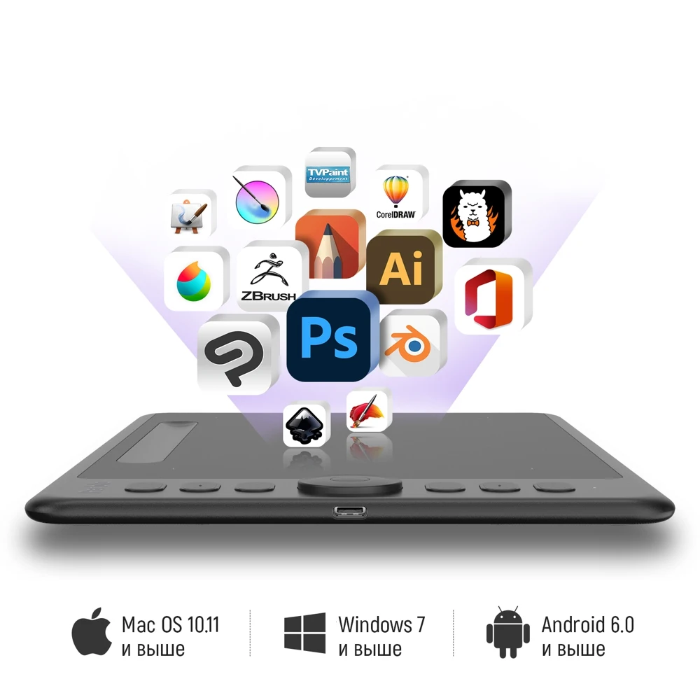 Parblo Intangbo S поддерживает все наиболее известные графические редакторы, такие как Photoshop, SAI, Painter, Illustrator, Clip Studio, Krita и т.д., а также поддерживает функционал для игры OSU!
