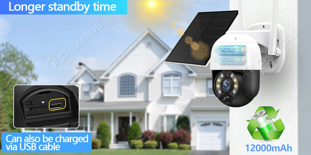О: обычно 365 дней, потому что эта камера видеонаблюдения имеет встроенный аккумулятор 14400mAh и солнечная панель обеспечит бесперебойную питание для него.