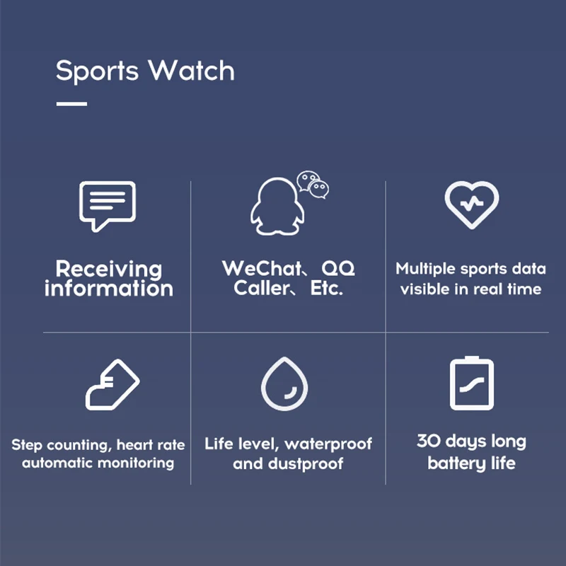 * Функции: спорт, сообщения, будильник, кислород в крови, дата, Измерение частоты сердечных сокращений, напоминание о сидячем положении, управление сном, время