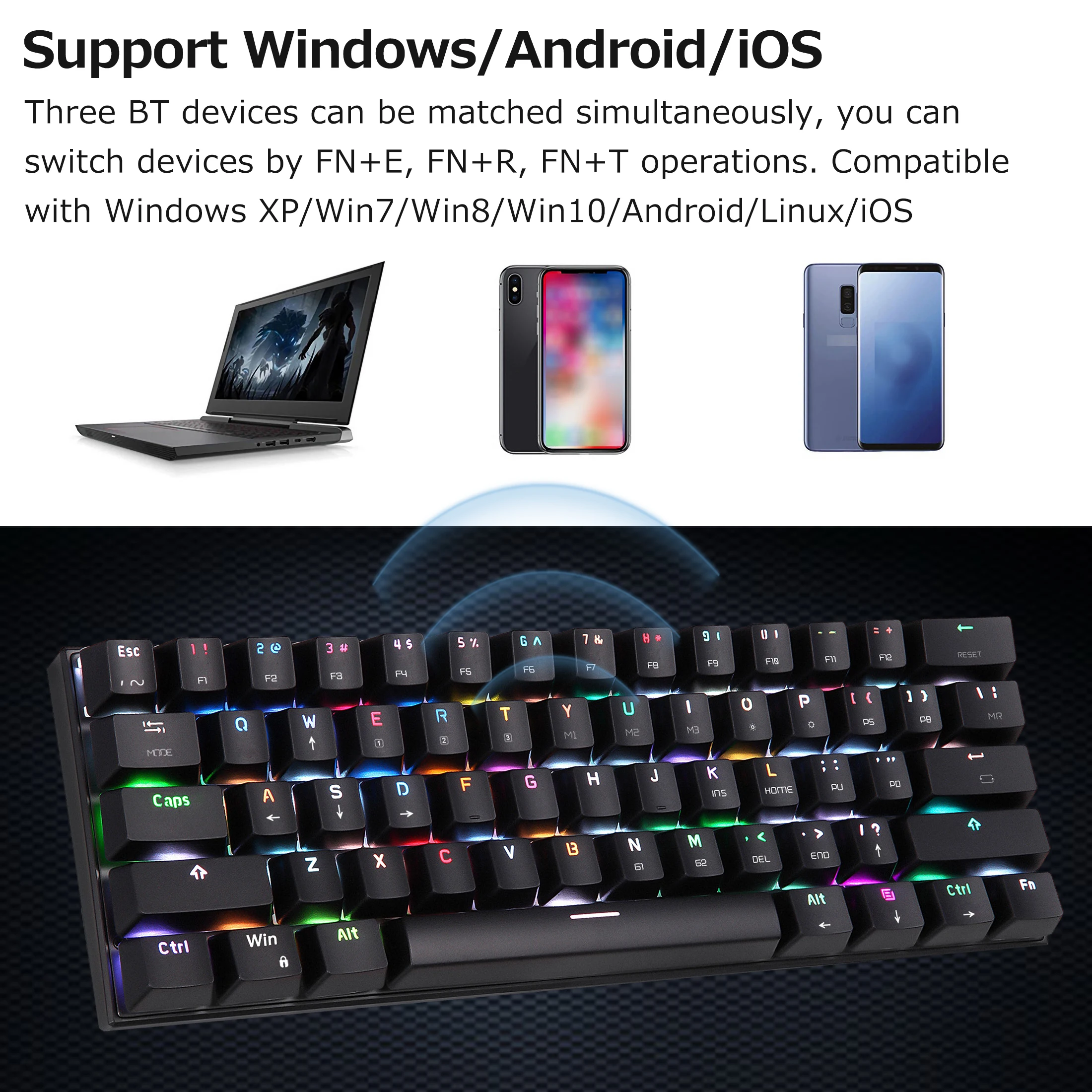 Эта клавиатура поддерживает Win/IOS/MAC/Android с BT эффективным расстоянием 10 метров. Множественное подключение одной машины, поддержка переключения между устройствами, FN + E,FN + R,FN + T коммутационные устройства. Он предназначен для копирайтера, программиста, редактора, которые тратят часы на печатание каждый день.