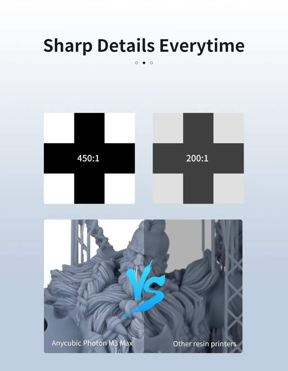 Коэффициент контрастности до 450:1, на 125% выше, чем у других полимерных принтеров (200:1), улучшает детали Anycubic Photon M3 Max других полимерных принтеров