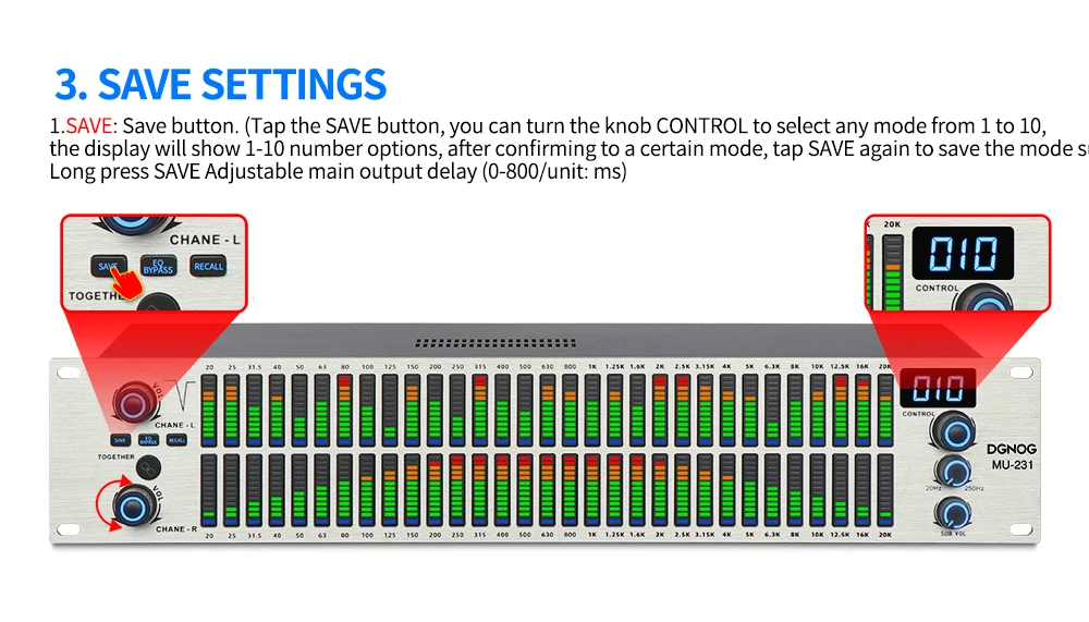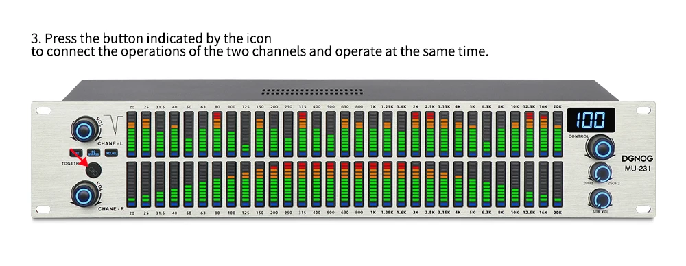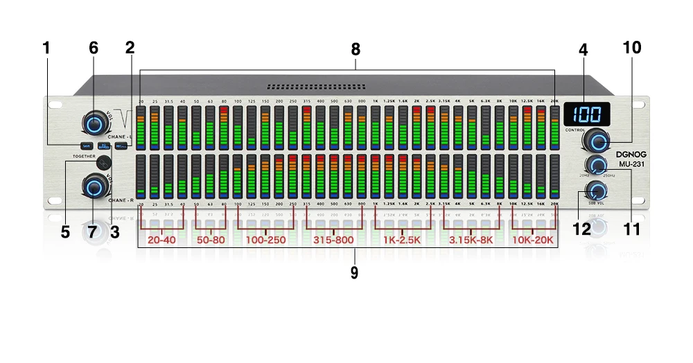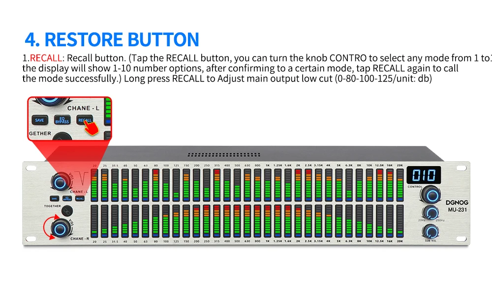 1. Байпас эквалайзера: кнопка байпаса эквалайзера. (Нажмите кнопку байпаса эквалайзера, машина не будет регулироваться какой-либо частотой