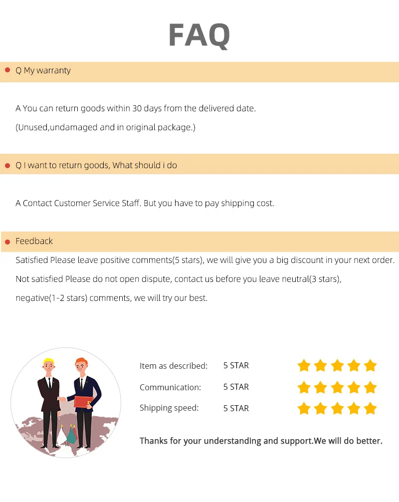 1. Ваши отзывы очень важны для нас и всех покупателей. Пожалуйста, потратьте несколько секунд, чтобы оставить отличные отзывы, если вы удовлетворены нашим продуктом и обслуживанием.