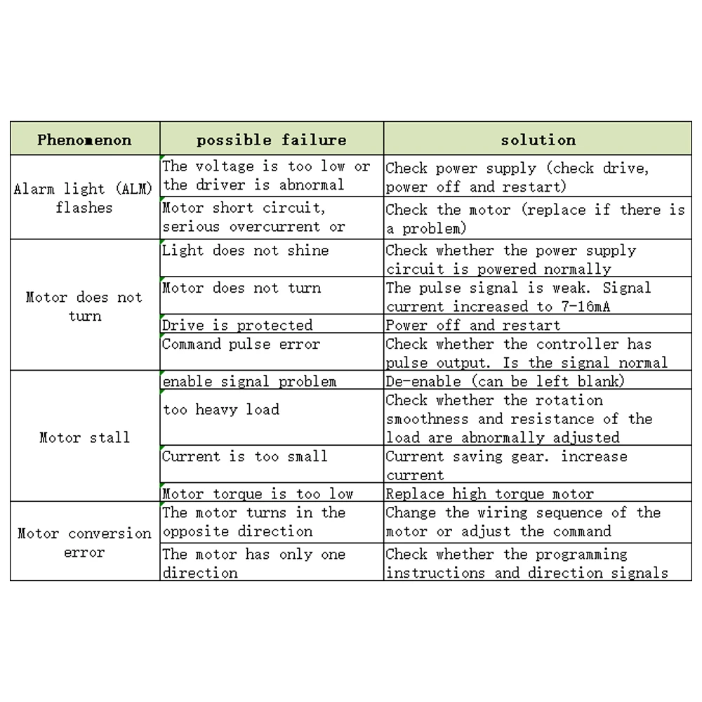 Напоминание: после подключения двигателя основная плата будет проводить испытания в момент включения питания. Если есть короткое замыкание, разность цепи и фазы, предупреждающий светильник ALM на основной плате будет мигать, и драйвер не будет работать. Отлично работает.