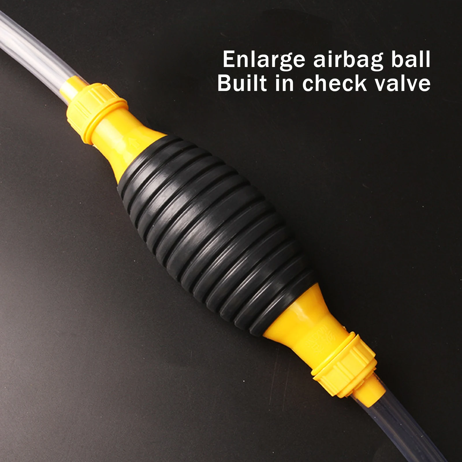 -Резиновый ручной насос, который быстро начинает просеивать поток жидкости. Длинный и толстый прозрачный шланг из ПВХ устойчив к воздействию масла и высокой температуре. Он оснащен двумя желтыми фитингами, которые увеличивают герметичность шланга и шарового насоса, чтобы предотвратить боковую утечку.
