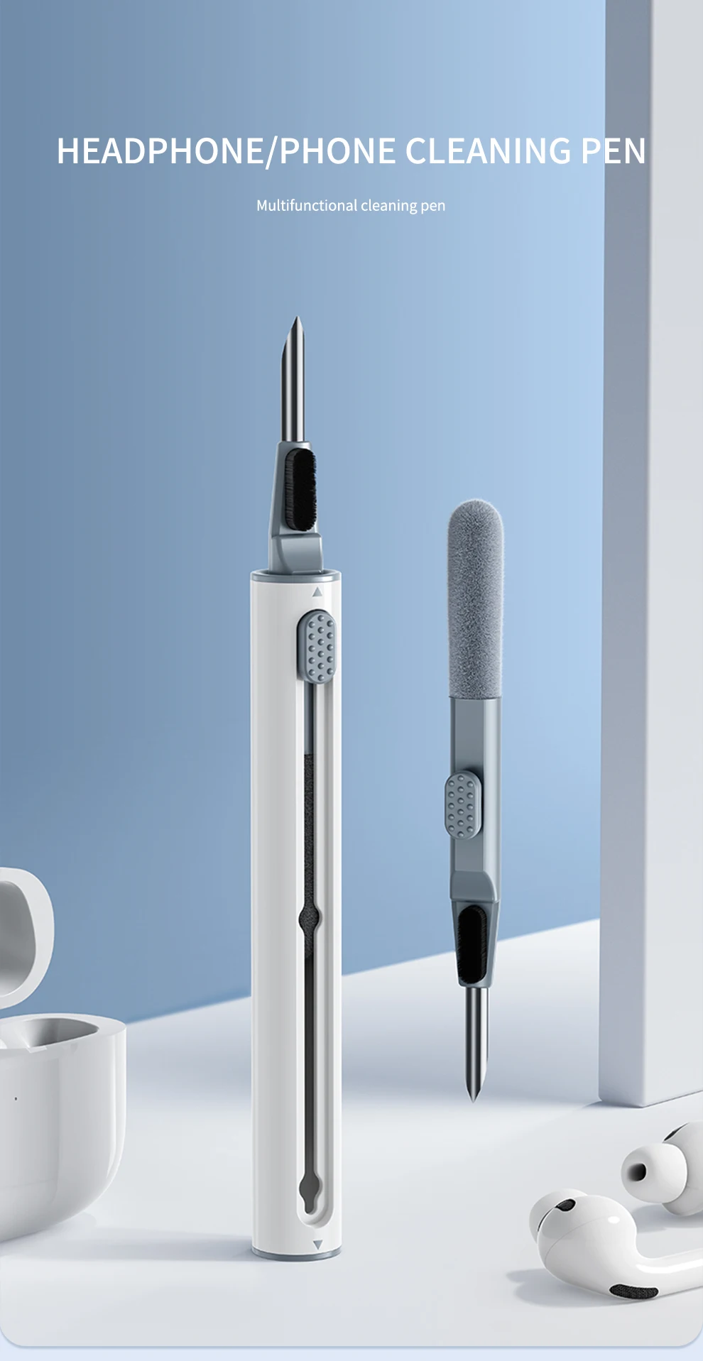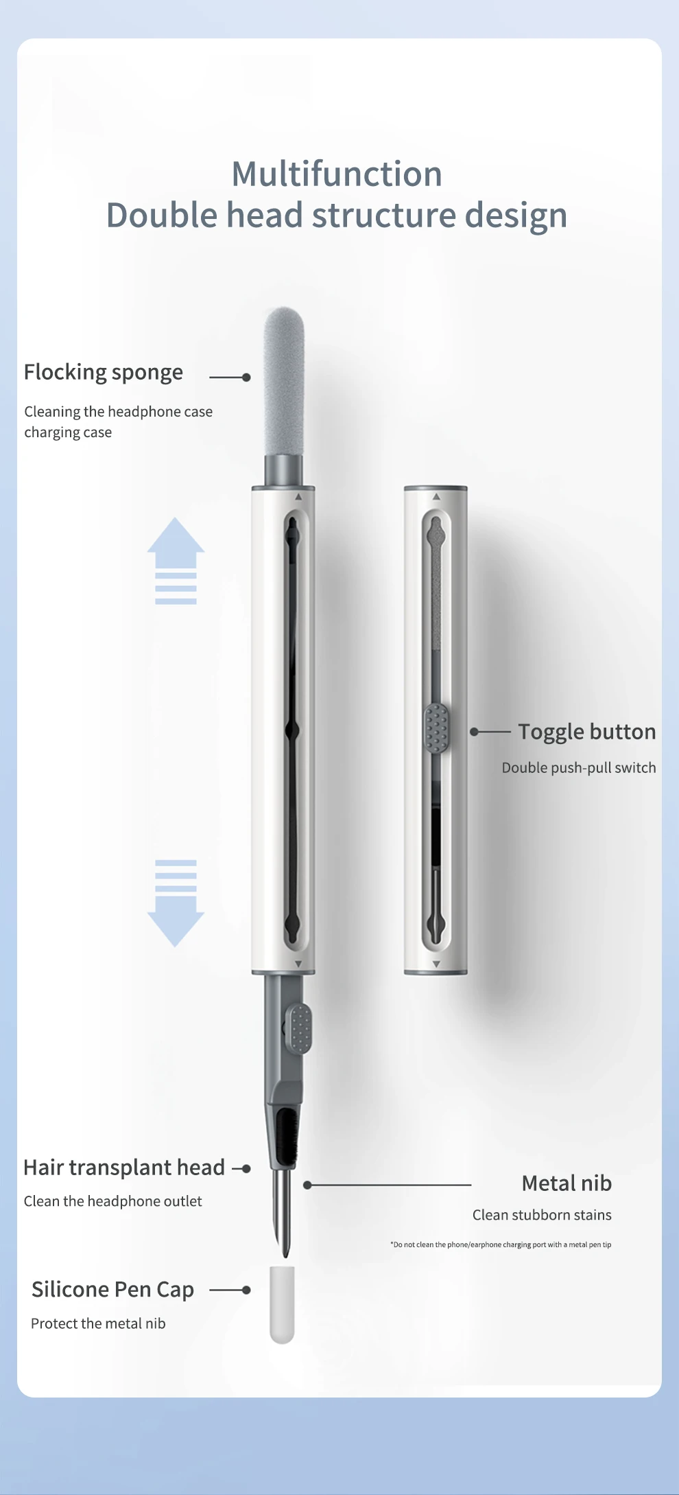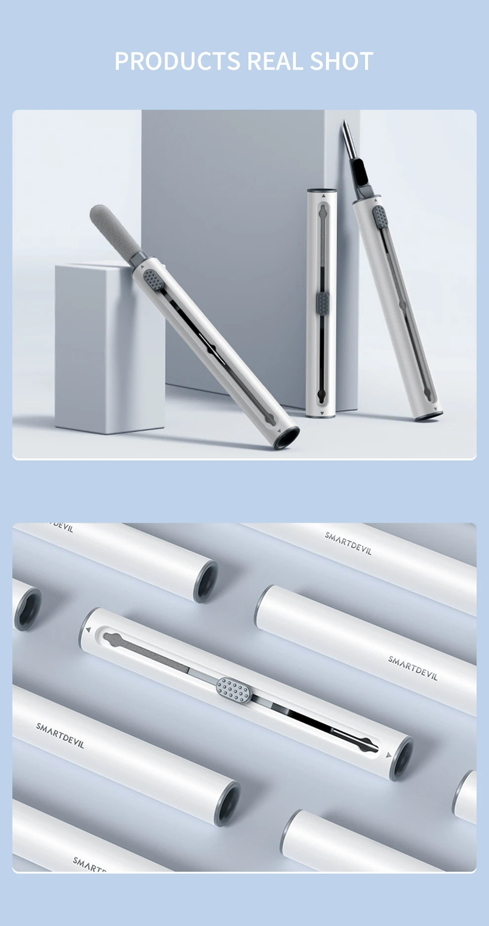 Раздельный дизайн с двумя головками:SmartDevil3-in-1 набор для чистки наушников с флокирующая губка, кисть высокой плотности и металлический наконечник ручки, двойная головка скрытого дизайна для удовлетворения различных потребностей в очистке