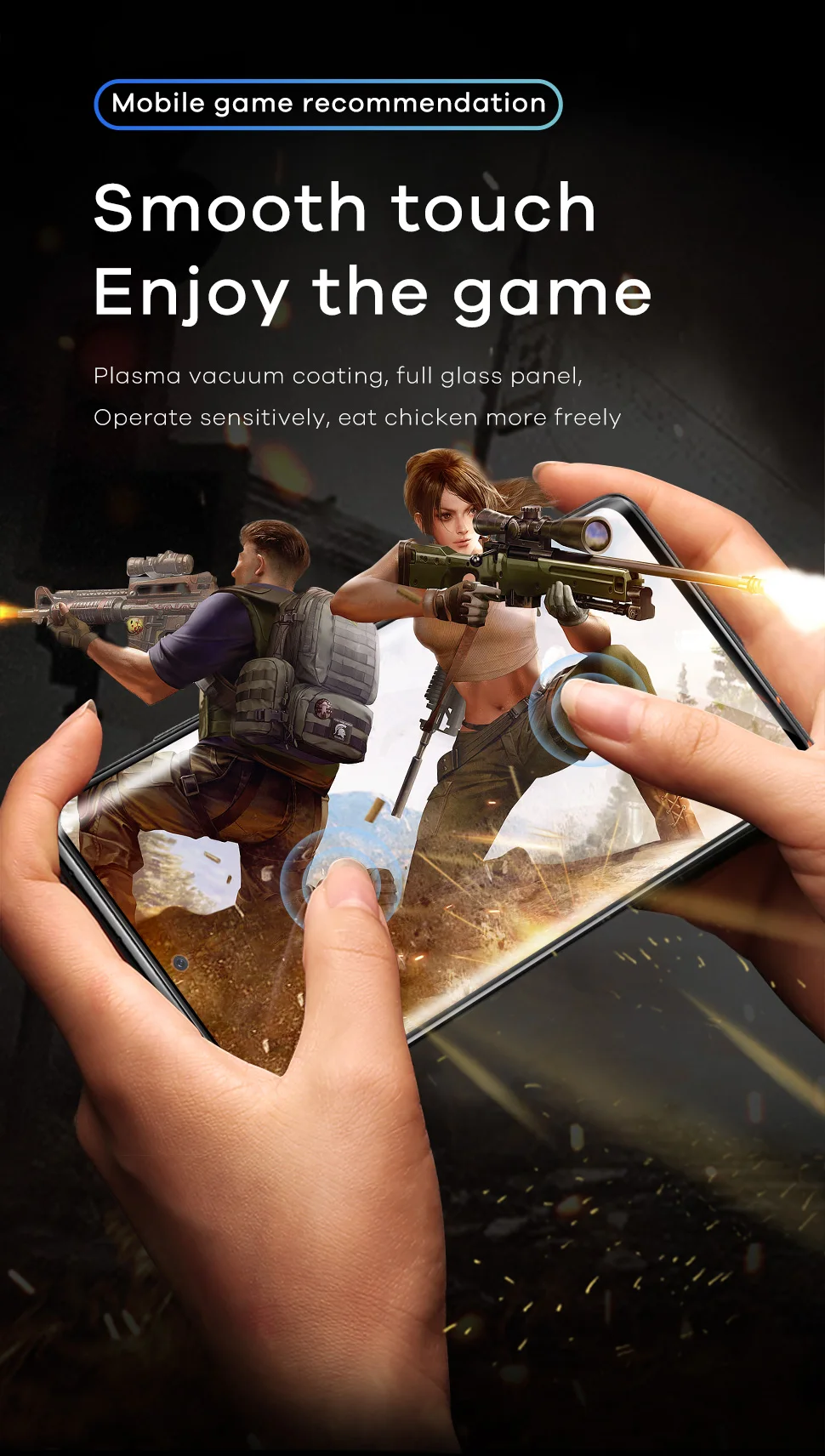 100% сенсорный точный и 3d-сенсорный датчик. Идеальная матовая поверхность имеет ощущение Шелкового прикосновения, волшебно сопротивляется загрязнениям, поту и раздражающим отпечаткам пальцев, почти не вызывает фрикционного сопротивления. Вы можете испытать комфортные ежедневные операции и игровые операции.