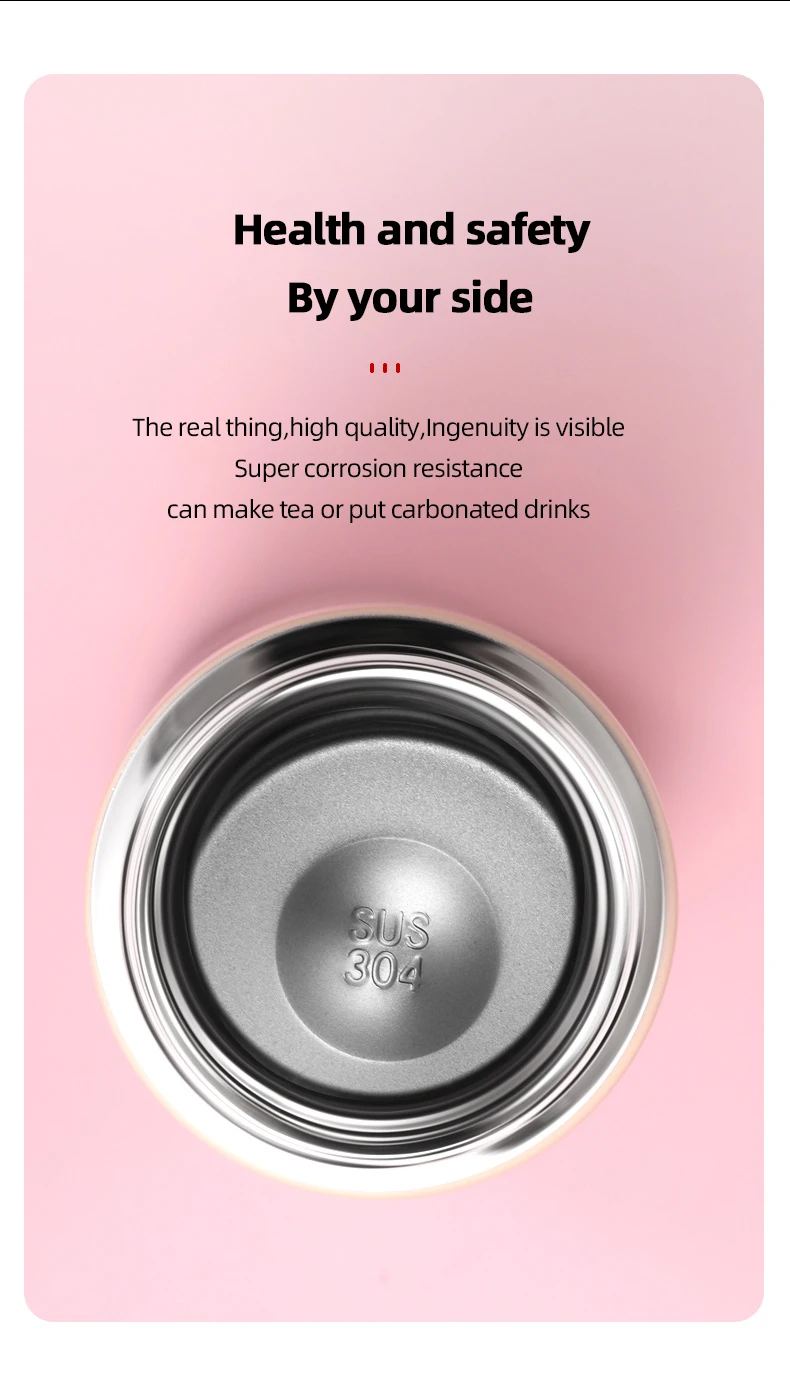 Изготовлен из нержавеющей стали 304, двухслойный вакуумный дизайн, безопасный, без BPA и экологически чистый, без запаха и легко моется. Он может держать горячую или холодную воду в течение 12 часов.