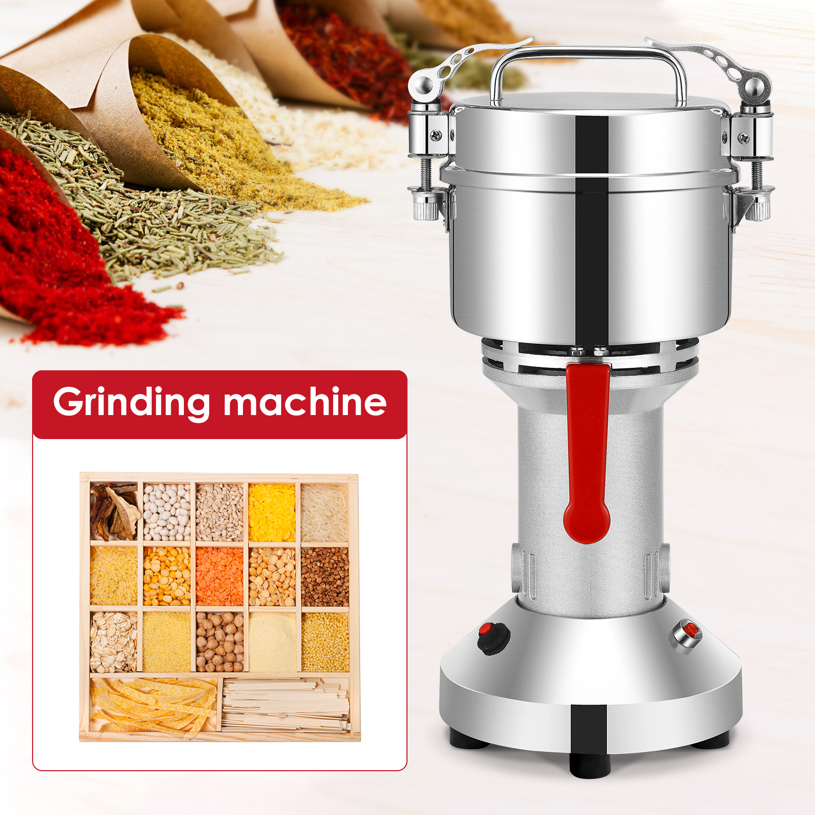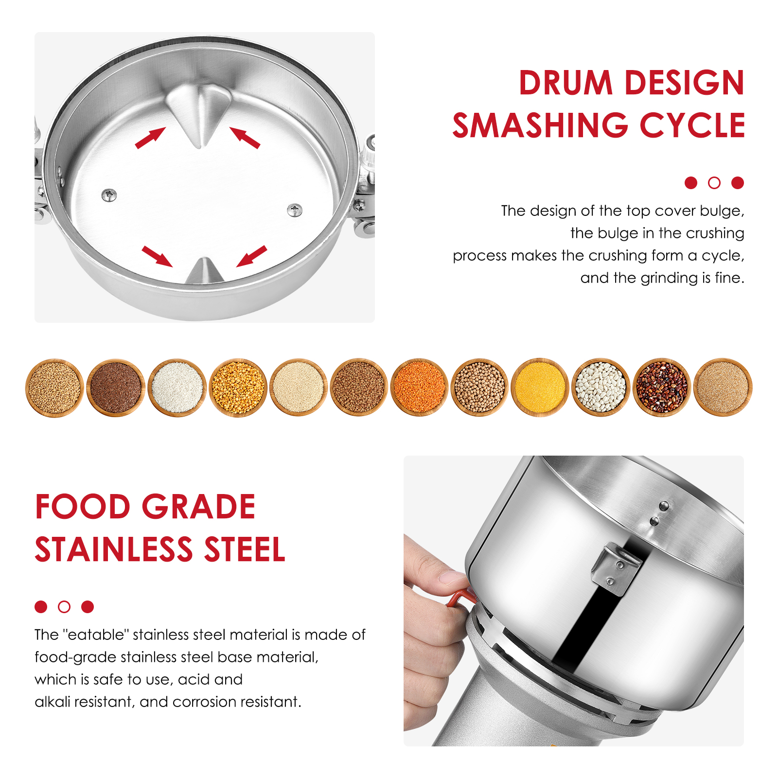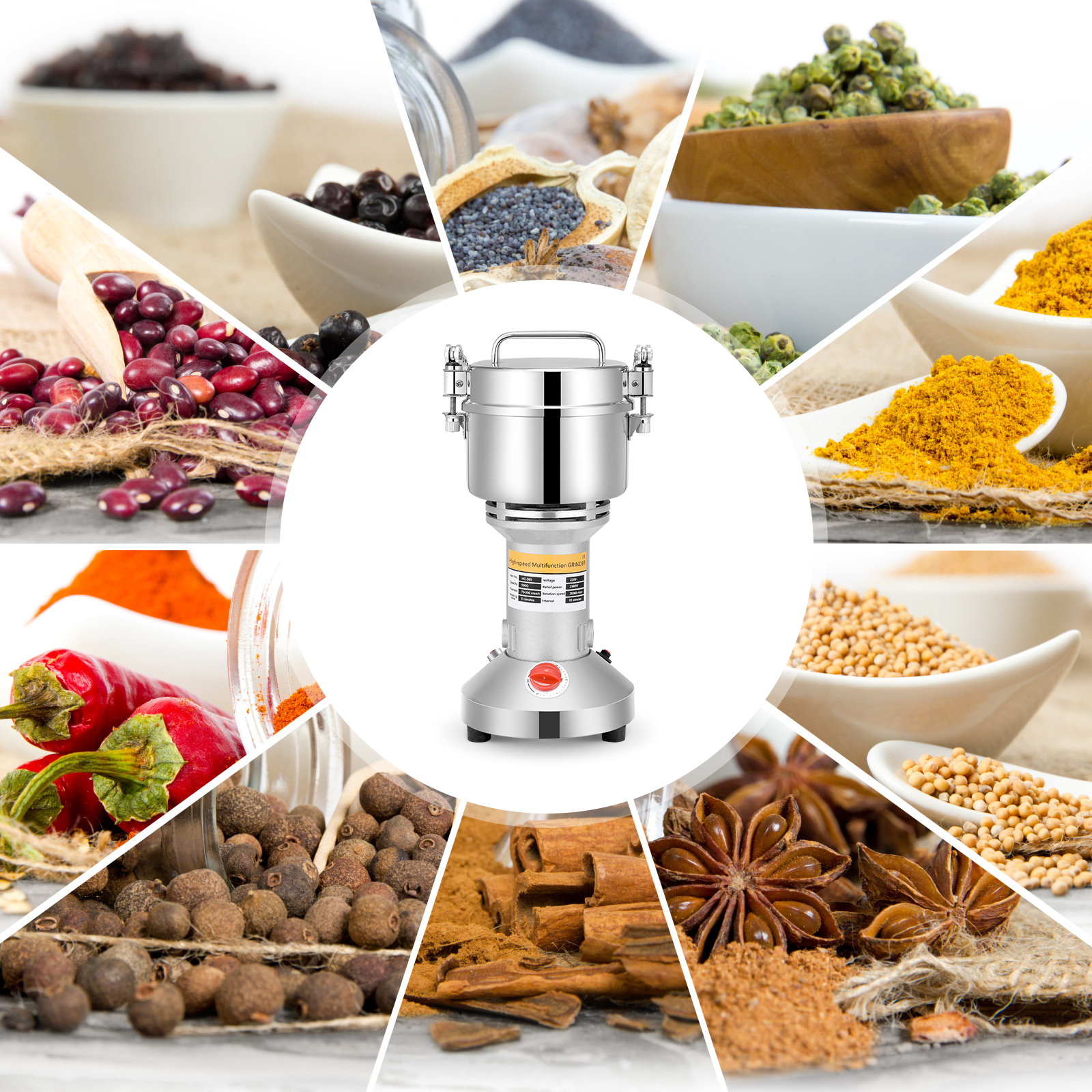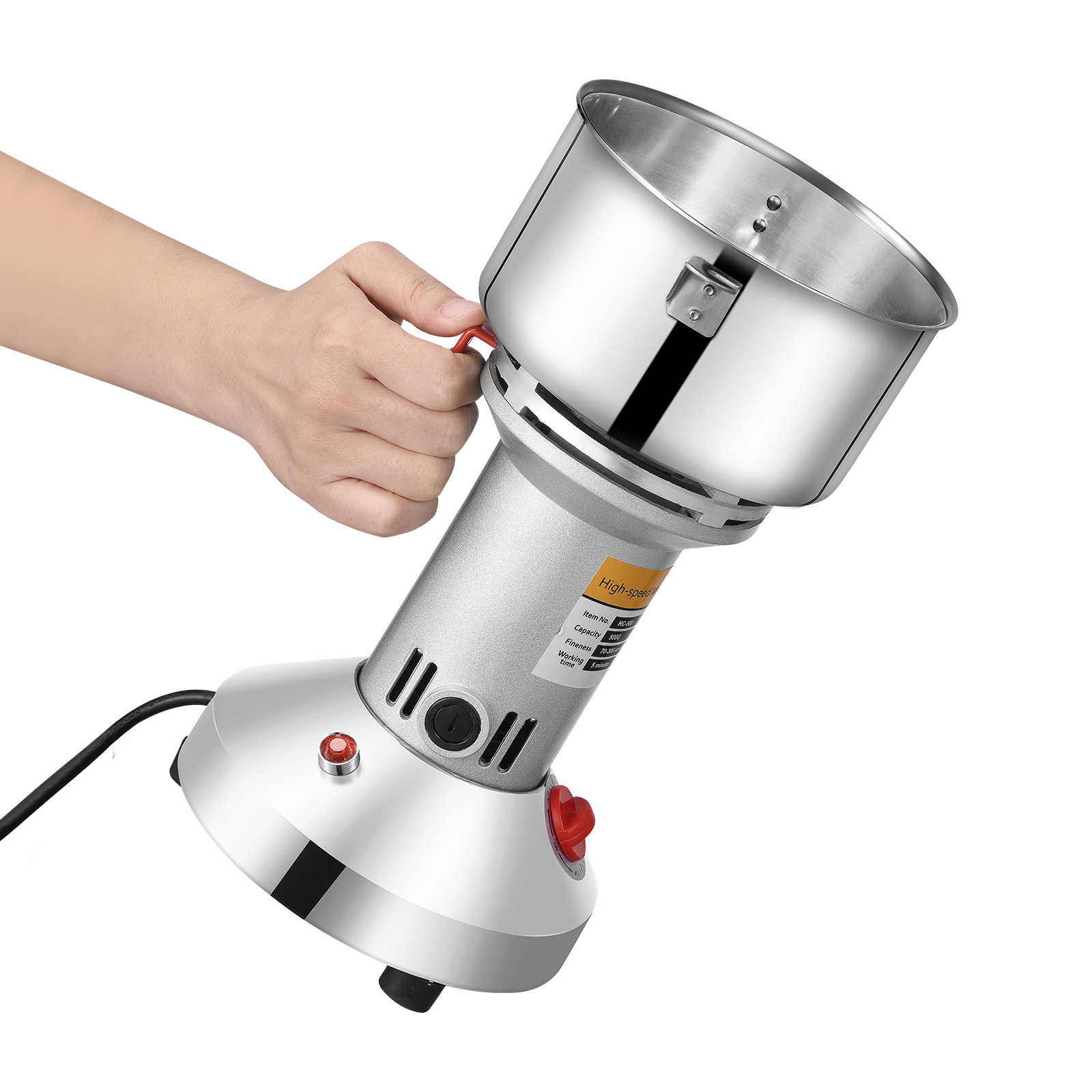 Это высокое качество нержавеющей стали высокоскоростной кофемолка имеет привлекательный дизайн, маленький размер, легкий вес, высокая эффективность и простота в использовании. Ждать. Он может быстро убивает все виды питания, риса, кукурузы, кунжута, соевых бобов, корм для рыб, перец, медицина (например, ganoderma, солодка, с искусственным жемчугом и камнями и т. д.).