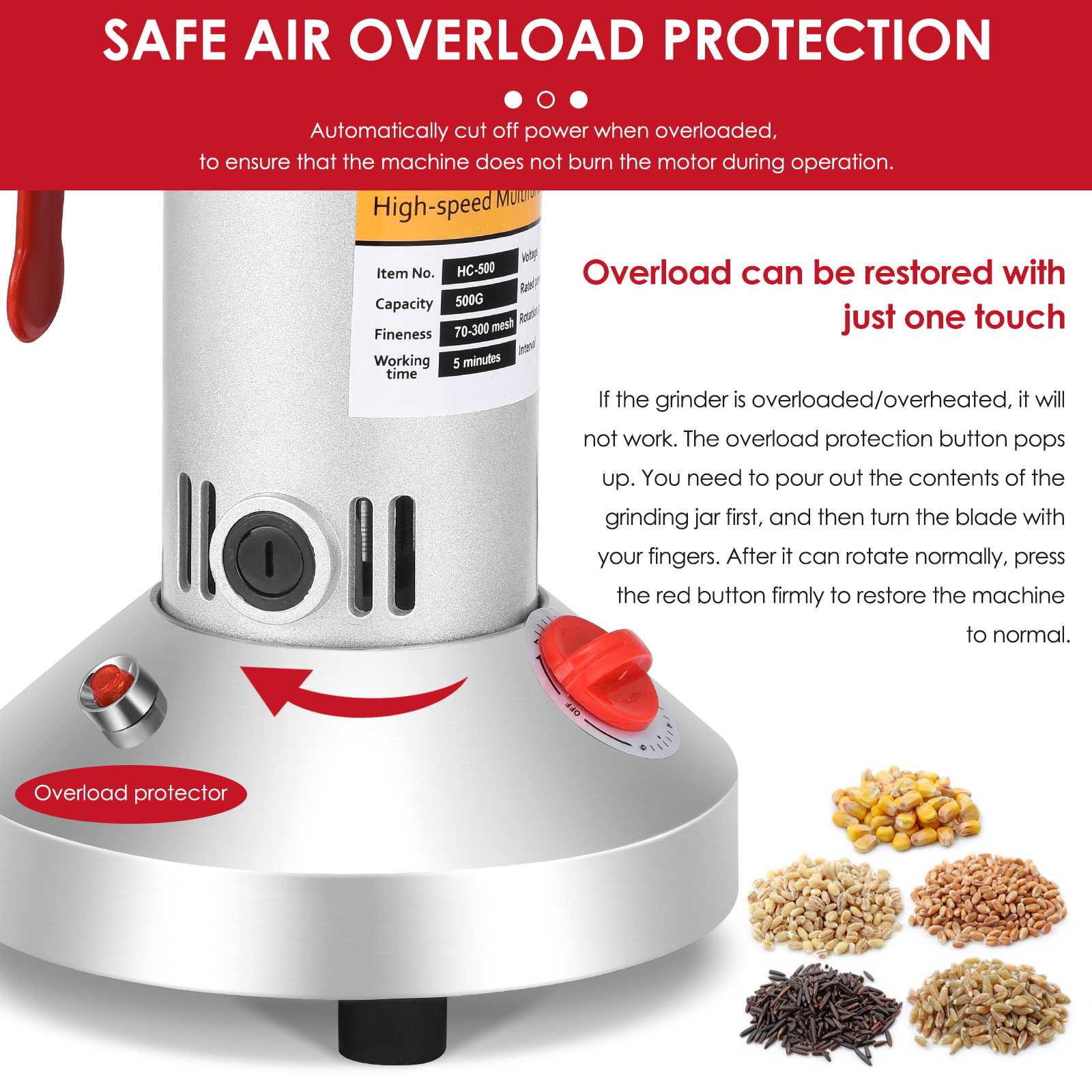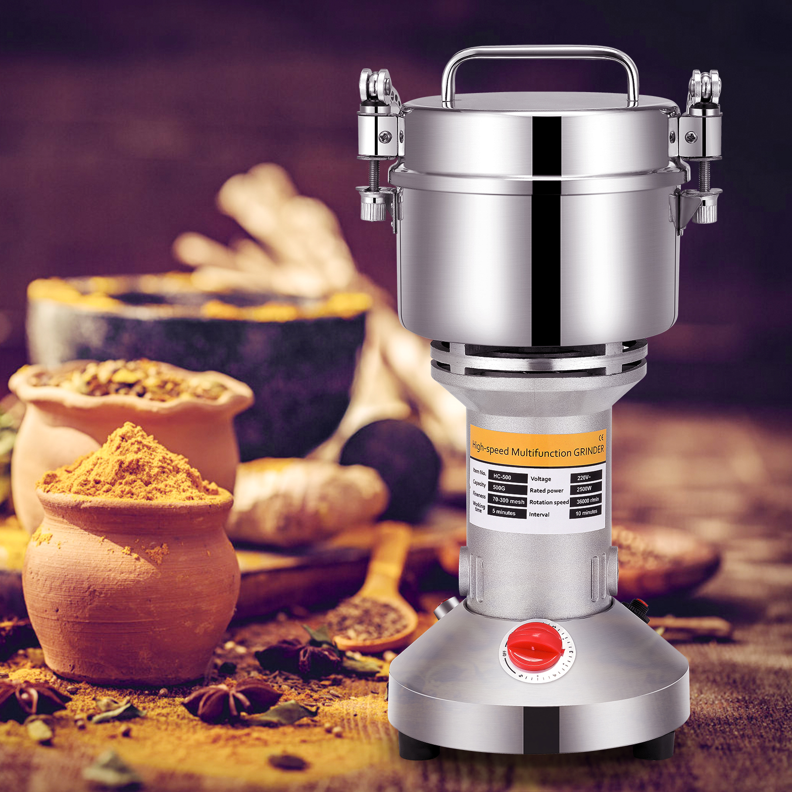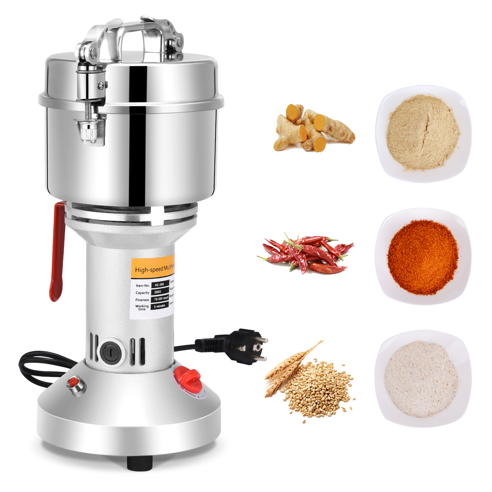 1. Скорость вращения шлифовальная машина Мотор:36000r/мин. Емкость: 500g, мощность мотора: 2500 Вт, время работы: 5 минут. Интервал: 10 минут, степень дробления: ультра-тонкая шлифовальная машина; Принцип: высокоскоростной шлифовальный, зернорубочная машина мощная и может легко переработки зерна