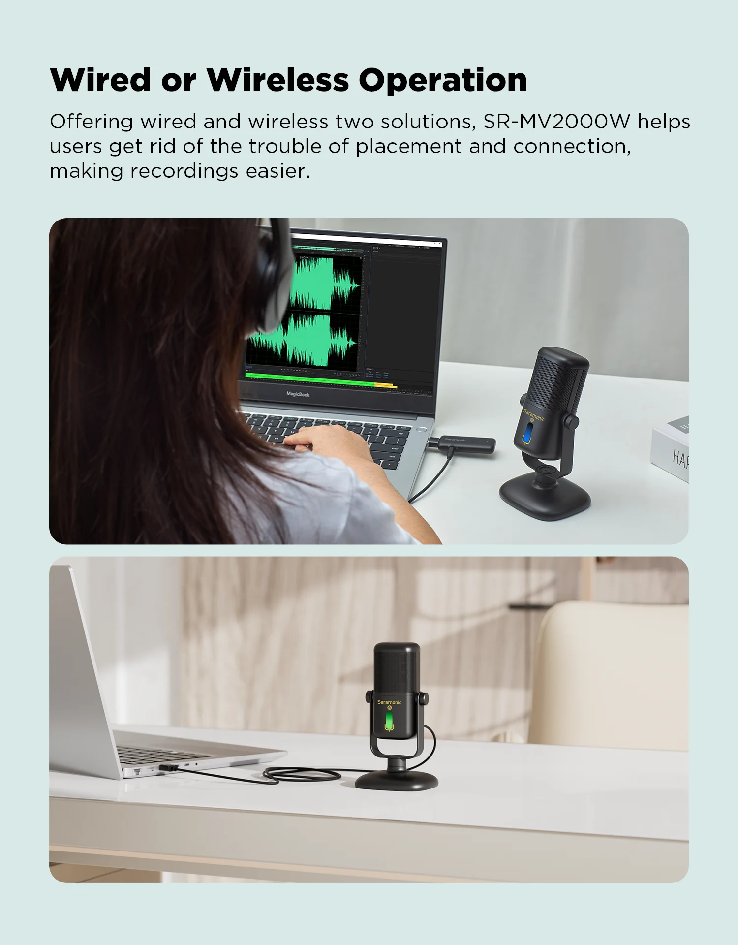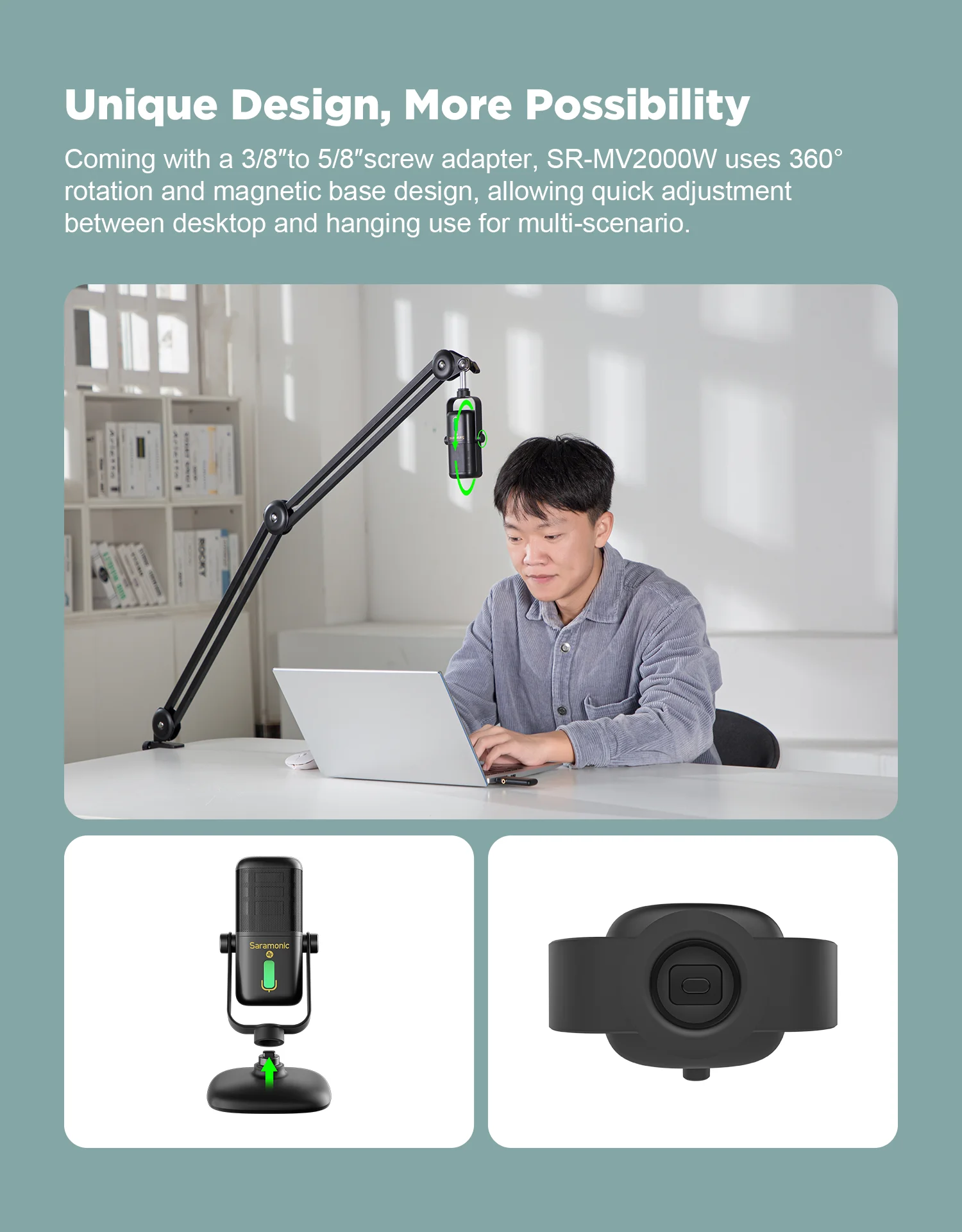 SR-MV2000W передатчик имеет встроенный поп-фильтр, кардиоидным узором, а также высокого качества 3,5 мм выход для наушников, в комплекте с высокой точностью, регулятор громкости, позволяет передавать тепло и звук присутствия, а также легко контролировать звук. Уникальная Съемная Магнитная настольная подставка позволяет SR-MV2000W легко смягчить удары и удары при снятии. Что лучше, интегрированная конструкция с поворотным креплением на 360 градусов может быть быстрой и удобной для позиционирования на столе, подставке для микрофона или в студии. Благодаря компактному корпусу и многоцветному светодиодному Индикатору SR-MV2000W утончила быстрый и простой способ записи.
