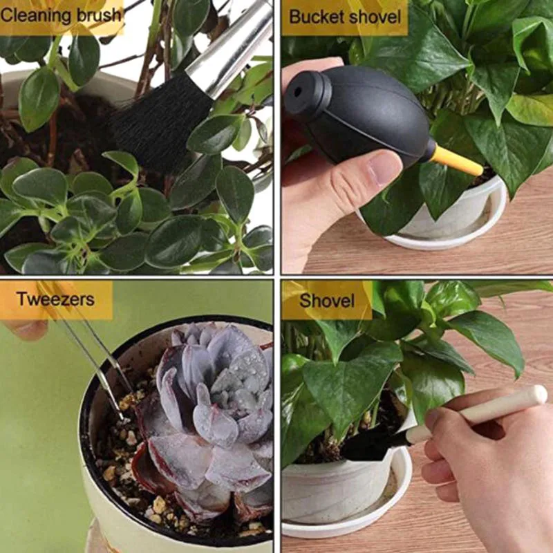 3 X мясистые инструменты (лопата, грабли, лопата),2 X инструменты для пересадки, 1 X бутылка для полива, 1 X поливочный распылитель, 1 X щетка для очистки, 1 X Воздушный пылесборник, 1 X ведро, 1 ножницы, 2 пинцета, 1 ложка