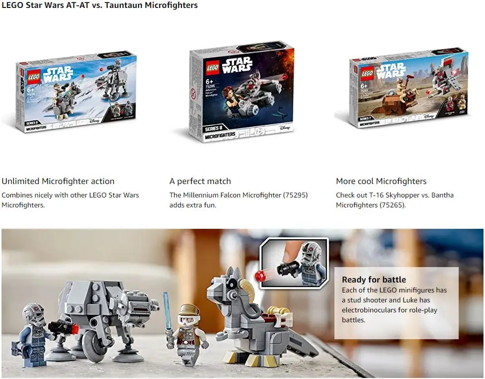 Этот набор микробойцов AT-AT vs. taundun (75298) состоит из 2 Минифигурок LEGO: Люка Скайуокера, светового меча, а у водителя AT-AT каждый из них есть стрелок-шпилька и элемент электробинокля
