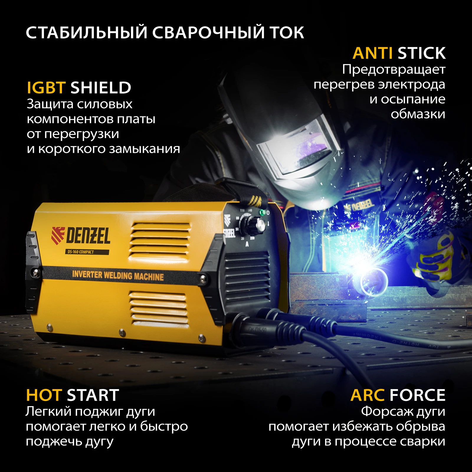 Легкий поджиг (Hot Start) — начало сварочного процесса упрощается, что позволяет легко и быстро приступить к работе. Надежность и долговечность — защита силовых компонентов платы (IGBT Shield) автоматически отключает аппарат при перегрузке или коротком замыкании.