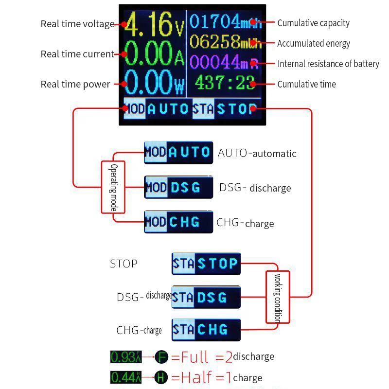 Пуск → зарядки (зарядный ток в режиме ожидания составляет менее 0.12A, триггер полного заряда, прекратит зарядку) → разрядки (Напряжение холостого хода составляет менее 2,7 V, триггер разрядки в комплекте) → зарядка (ток зарядки менее 0,12 A триггер полной зарядки, остановка зарядки) → полная остановка