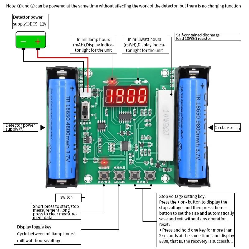 ①Установите блок питания 18650 батареи и 18650 батареи для тестирования;