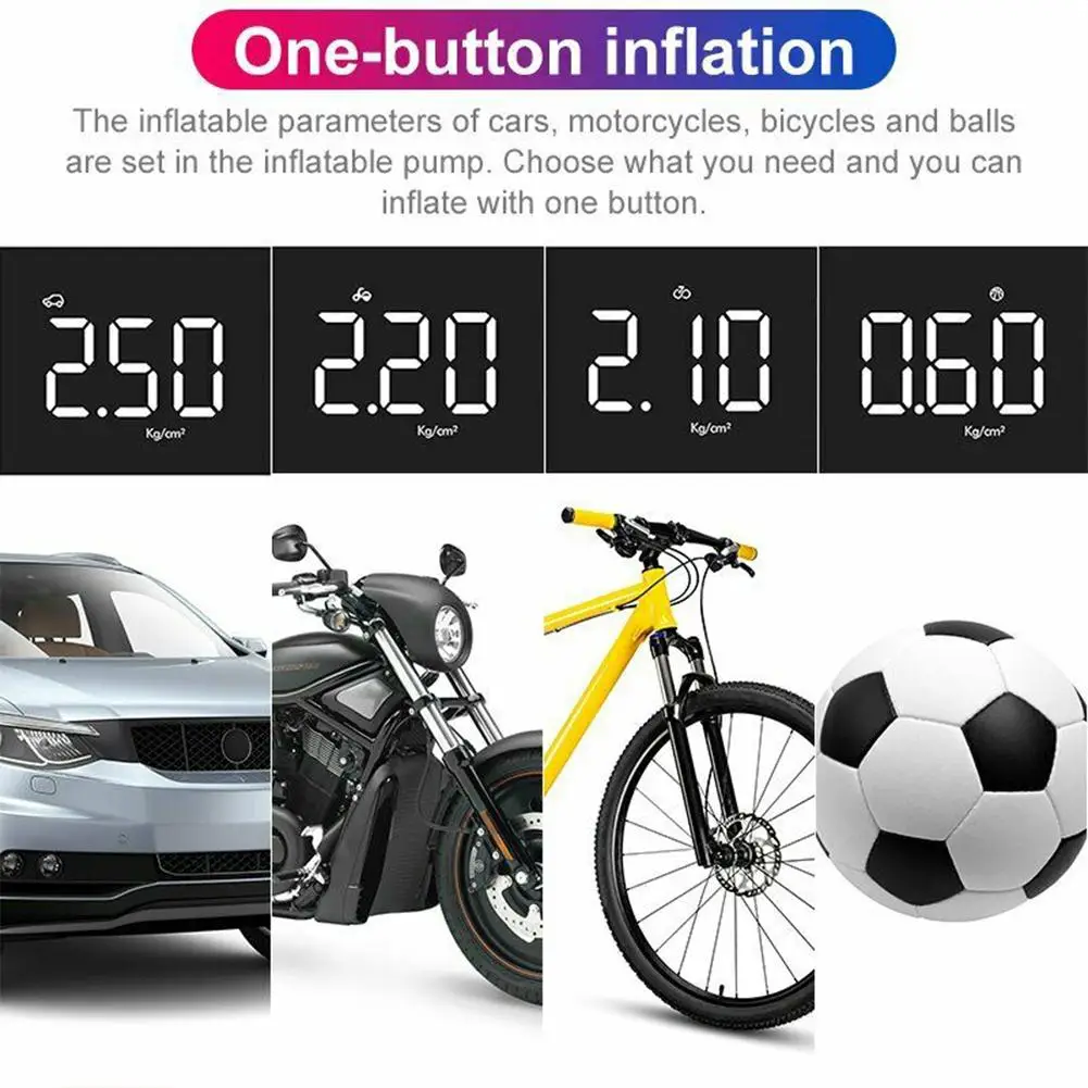 4. Wide range of uses: the air pump has built-in inflation parameters for bicycles, motorcycles, cars, SUV/RV tires and balls. It also comes with 3 nozzle adapters for inflatable products such as mattresses, airships, inflatable toys, sports equipment and more. Select the one-touch inflation you need to accomplish.
