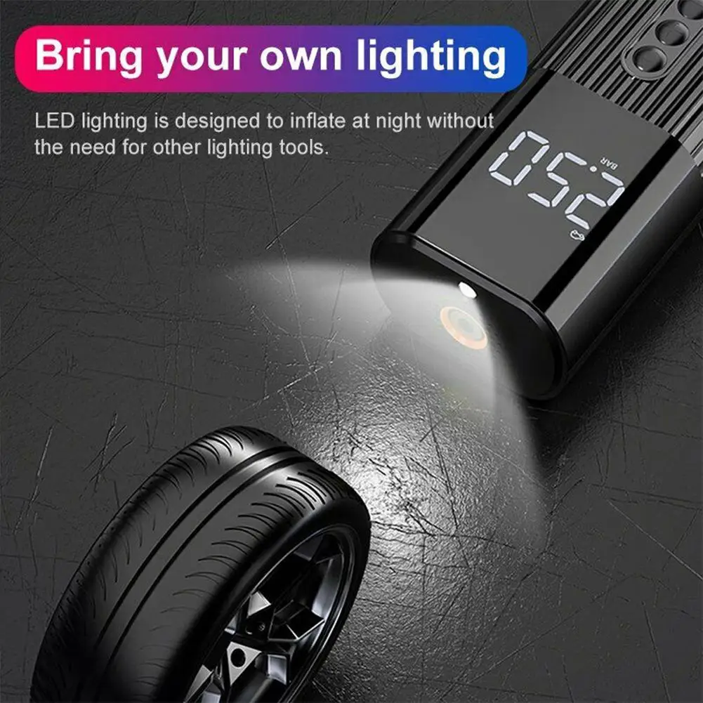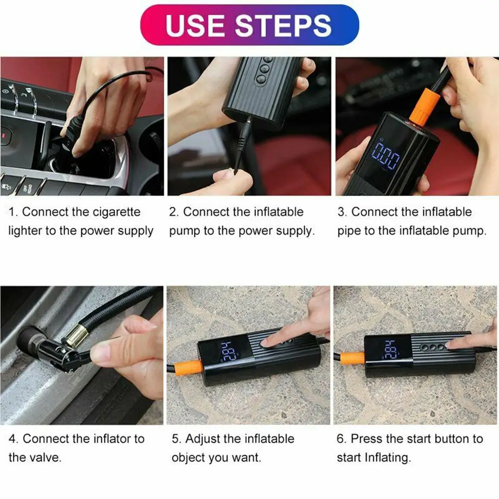 1. Wired Portable Design: The wired design and compact miniature size of this tire inflator make it easy to carry and operate with one hand. You only need 4 steps to start inflation. The side LED screen displays the pressure in real time, and you can monitor the pressure without bending over to look at the bottom.