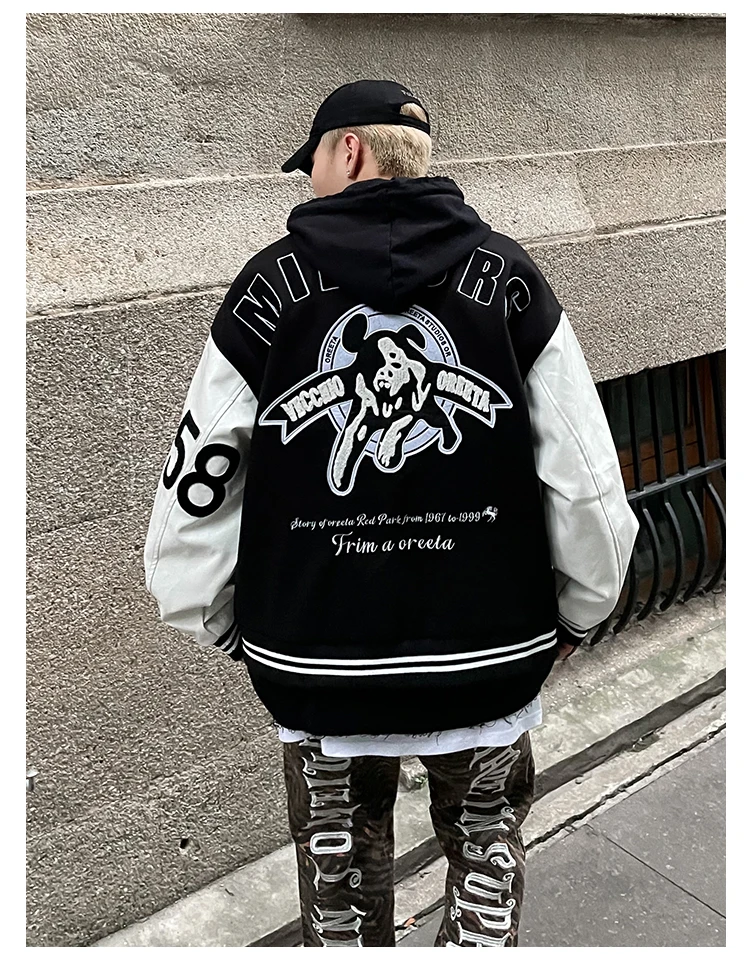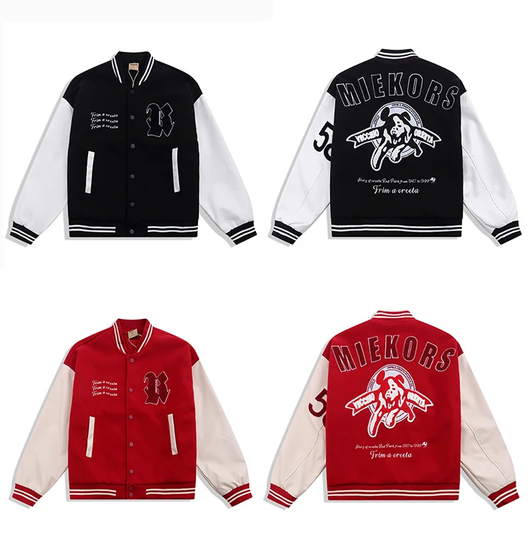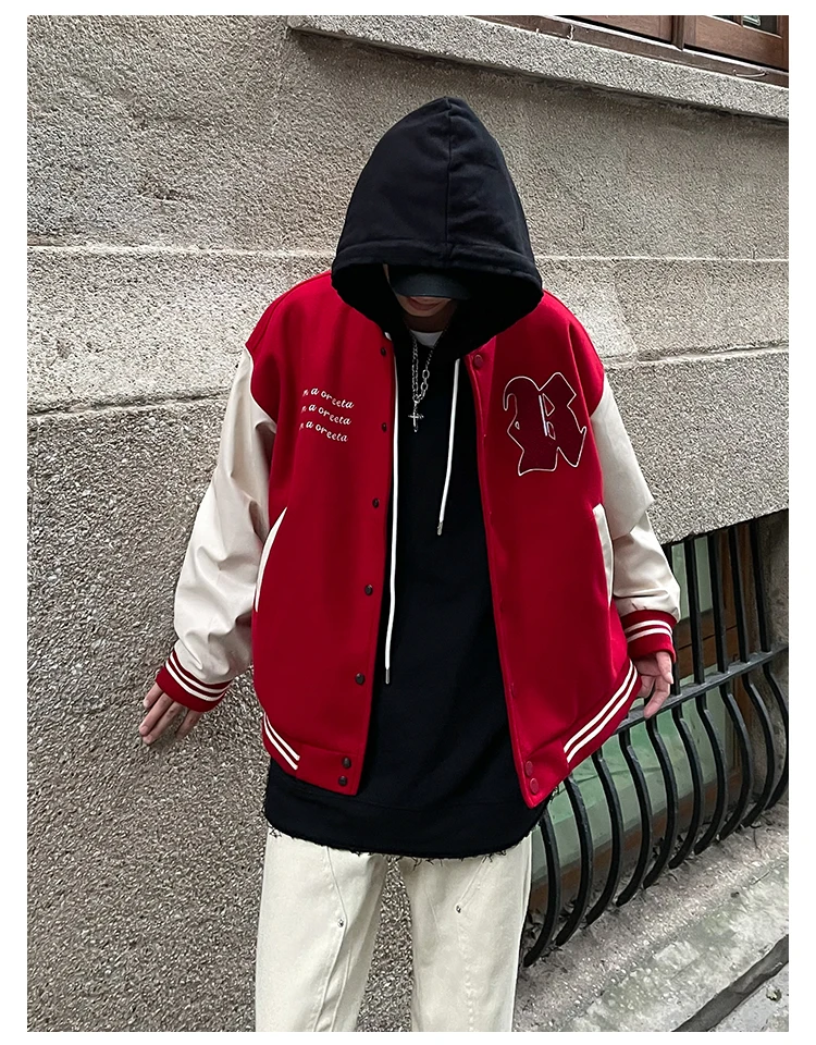 Черная, красная университетская куртка больших размеров, винтажная мужская бейсбольная куртка-бомбер с вышитыми буквами R, женская уличная одежда в стиле хип-хоп с кожаными рукавами